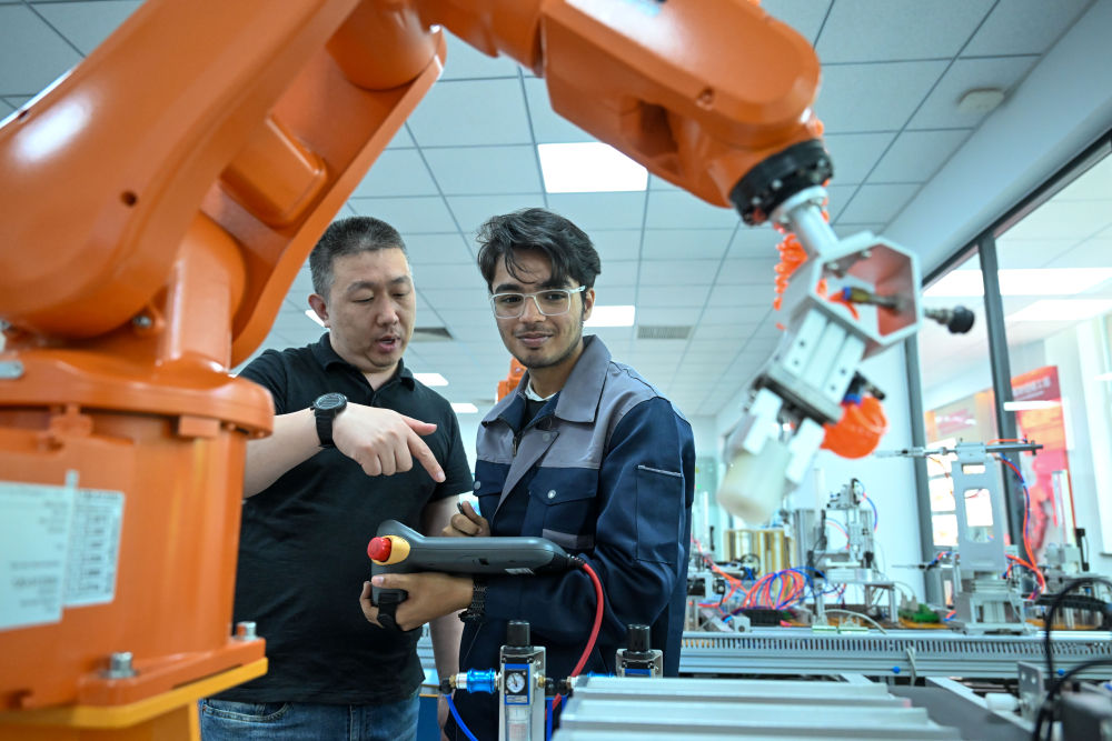 6月16日,在天津现代职业技术学院鲁班工坊国际教学中心,教师指导穆杉操作设备。新华社记者 孙凡越 摄