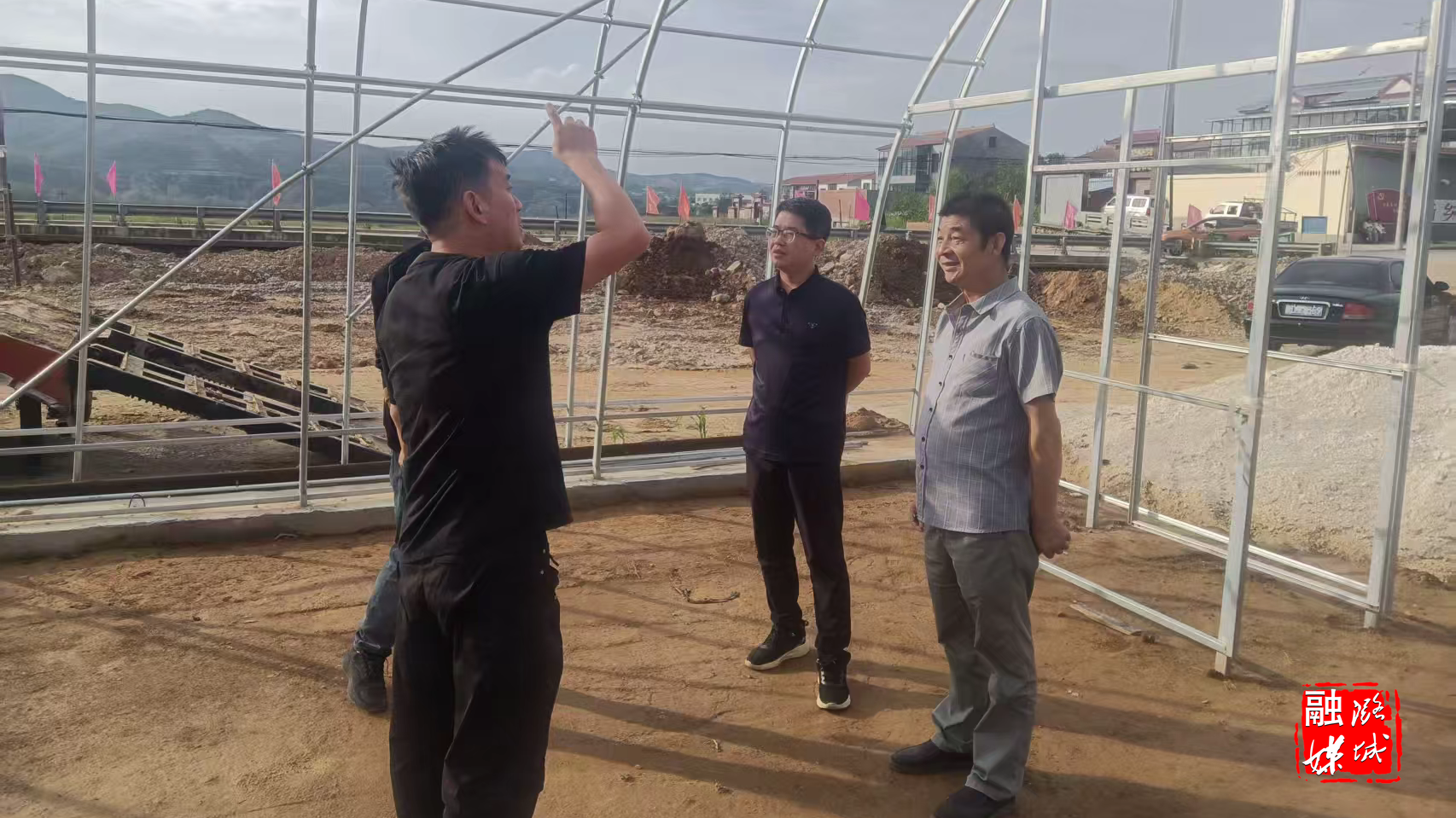 ▲黄牛蹄乡相关负责人同香菇种植技术人员规划香菇棚基地建设。