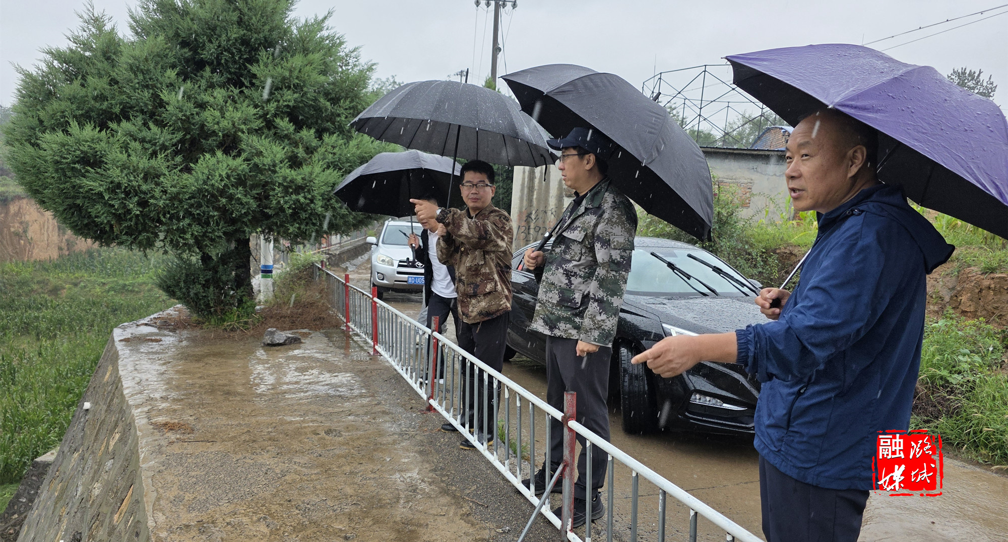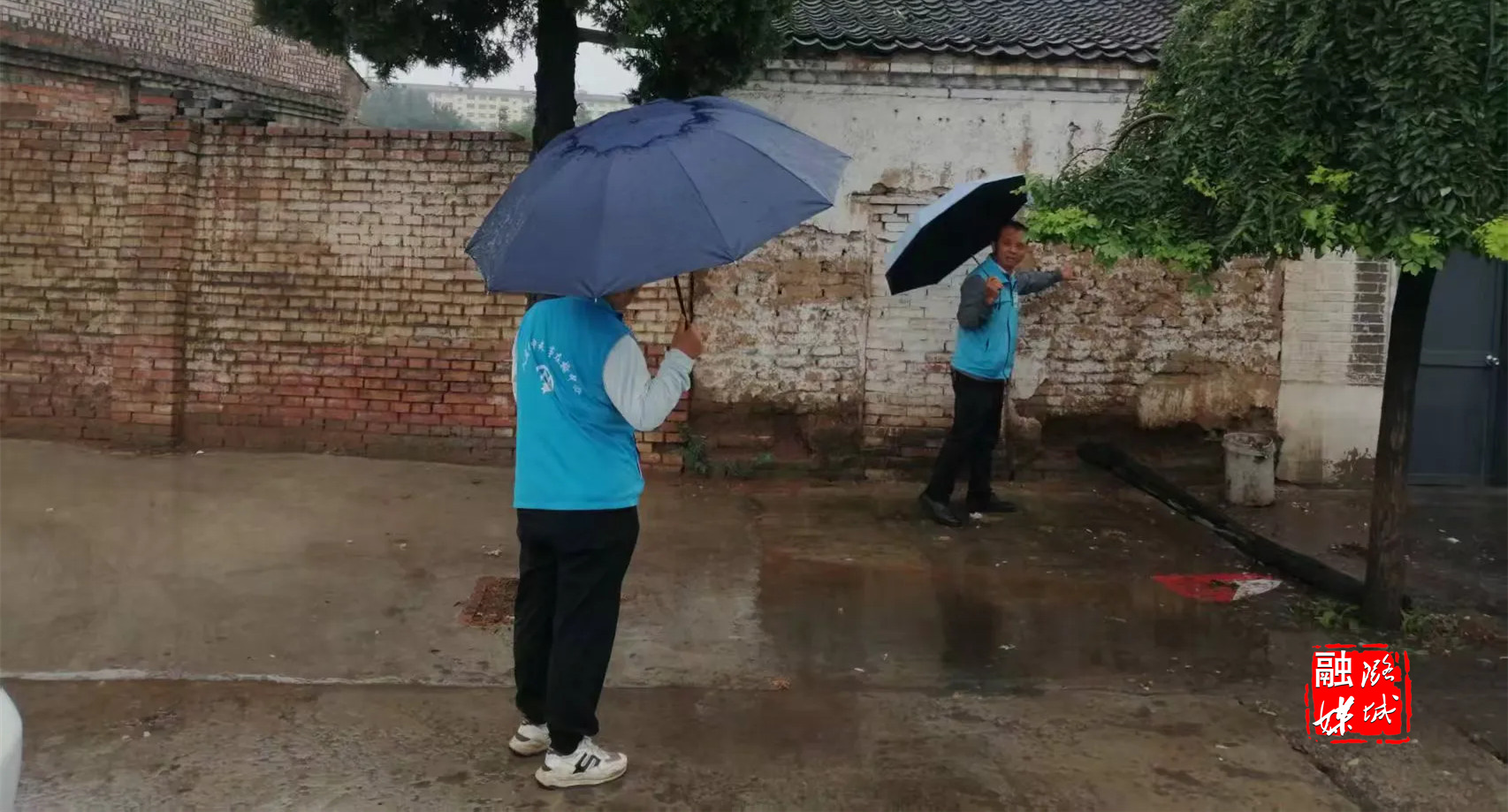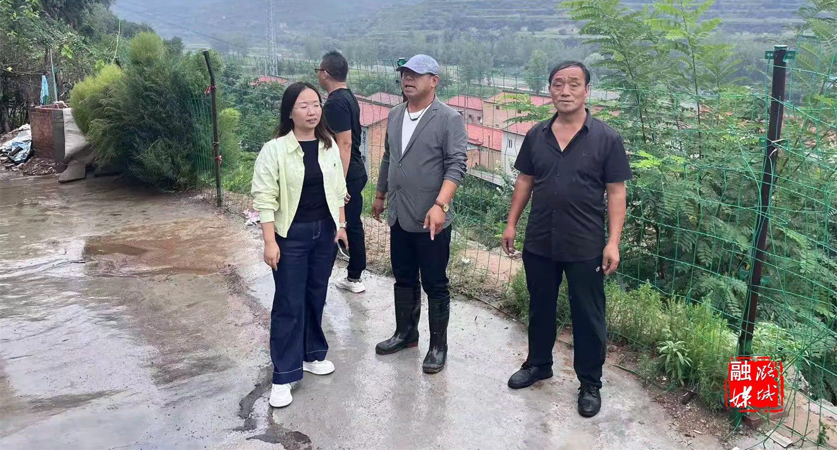 ▲店上镇石窟村工作人员开展防汛隐患排查,筑牢汛期安全防线。