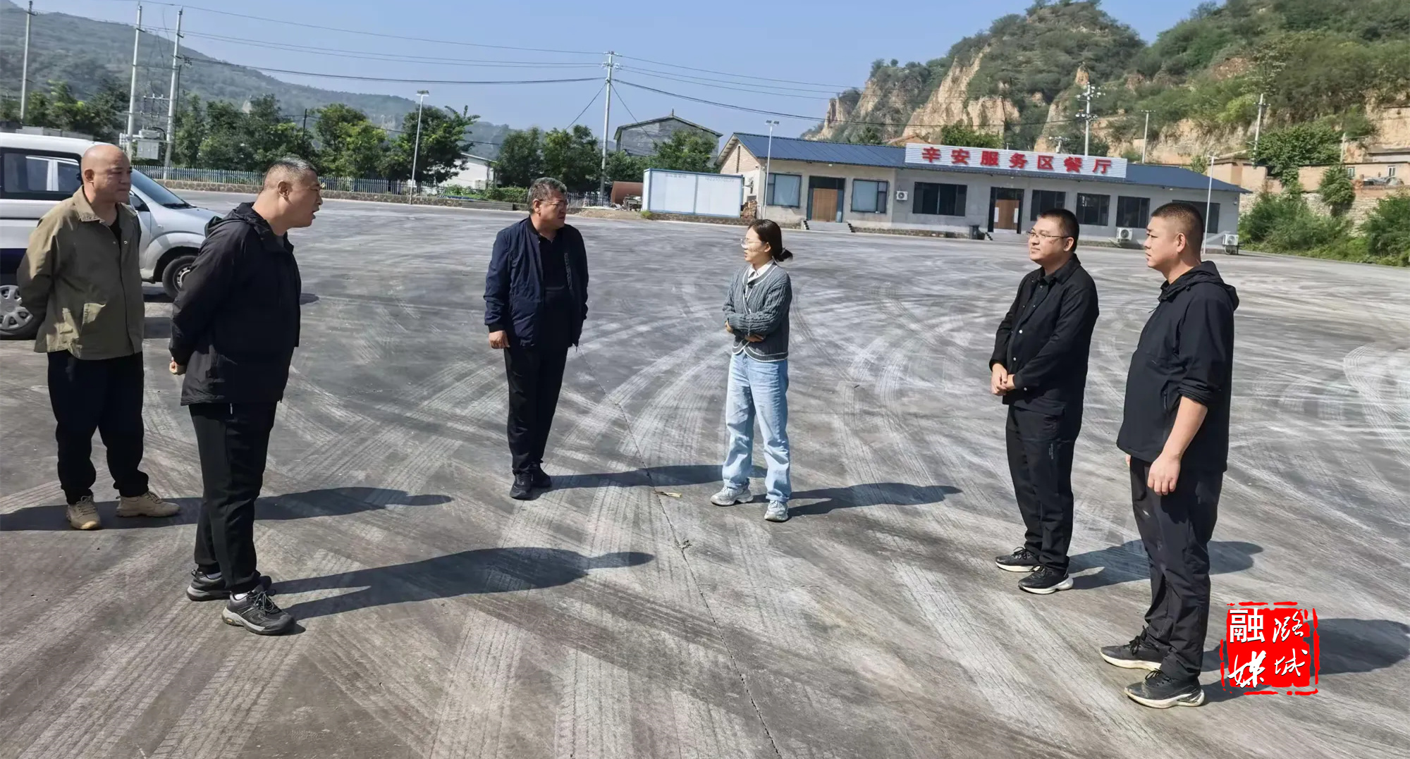 ▲黄牛蹄乡相关负责人与区环卫中心工作人员到辛安村就垃圾中转站整体规划进行实地勘查。