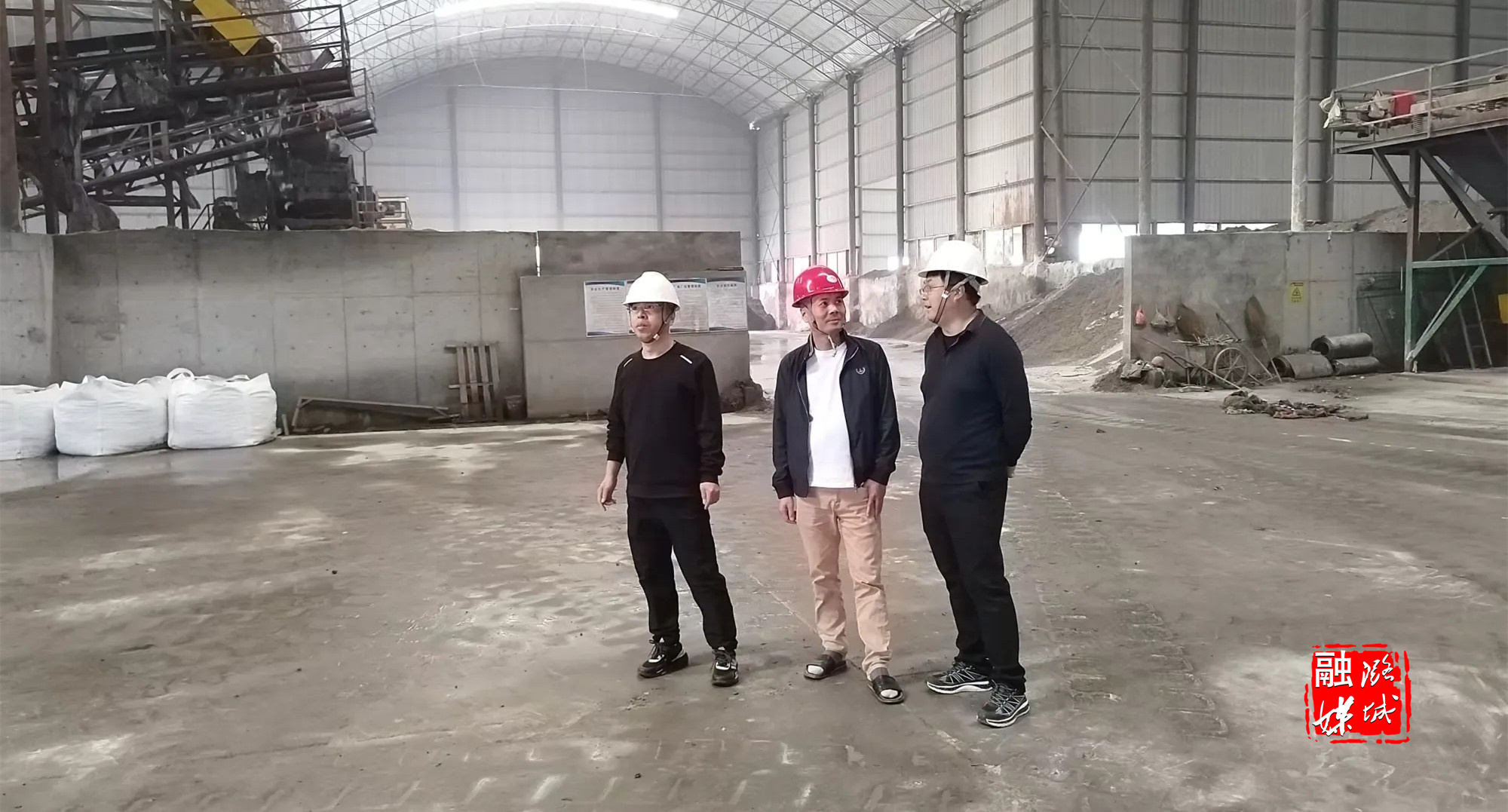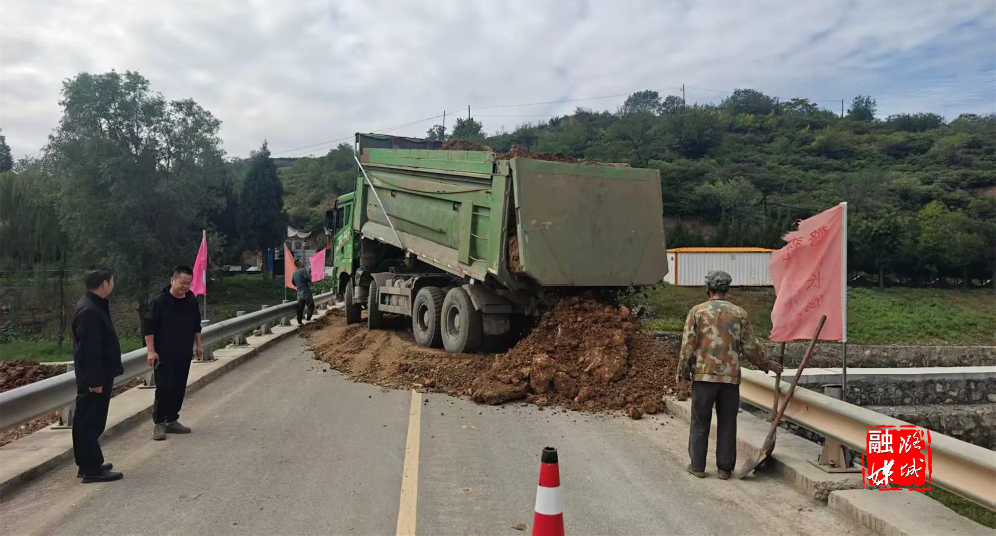 ▲黄牛蹄乡相关负责人查看河道渣土清理及香菇基地建设情况。