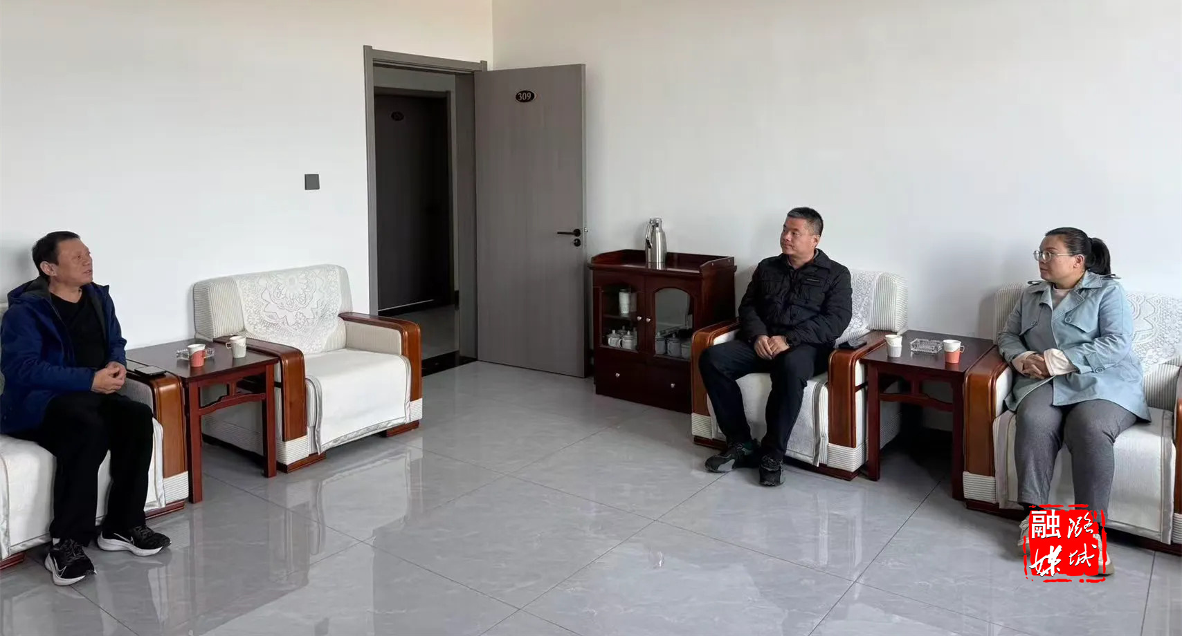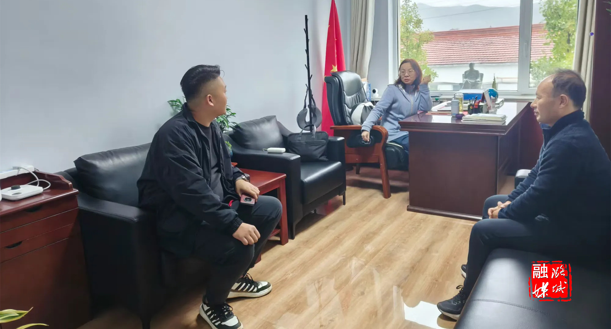 ▲店上镇工作人员与区供销合作社联合社理事会负责人就店上镇农贸市场相关事宜进行沟通交流。
