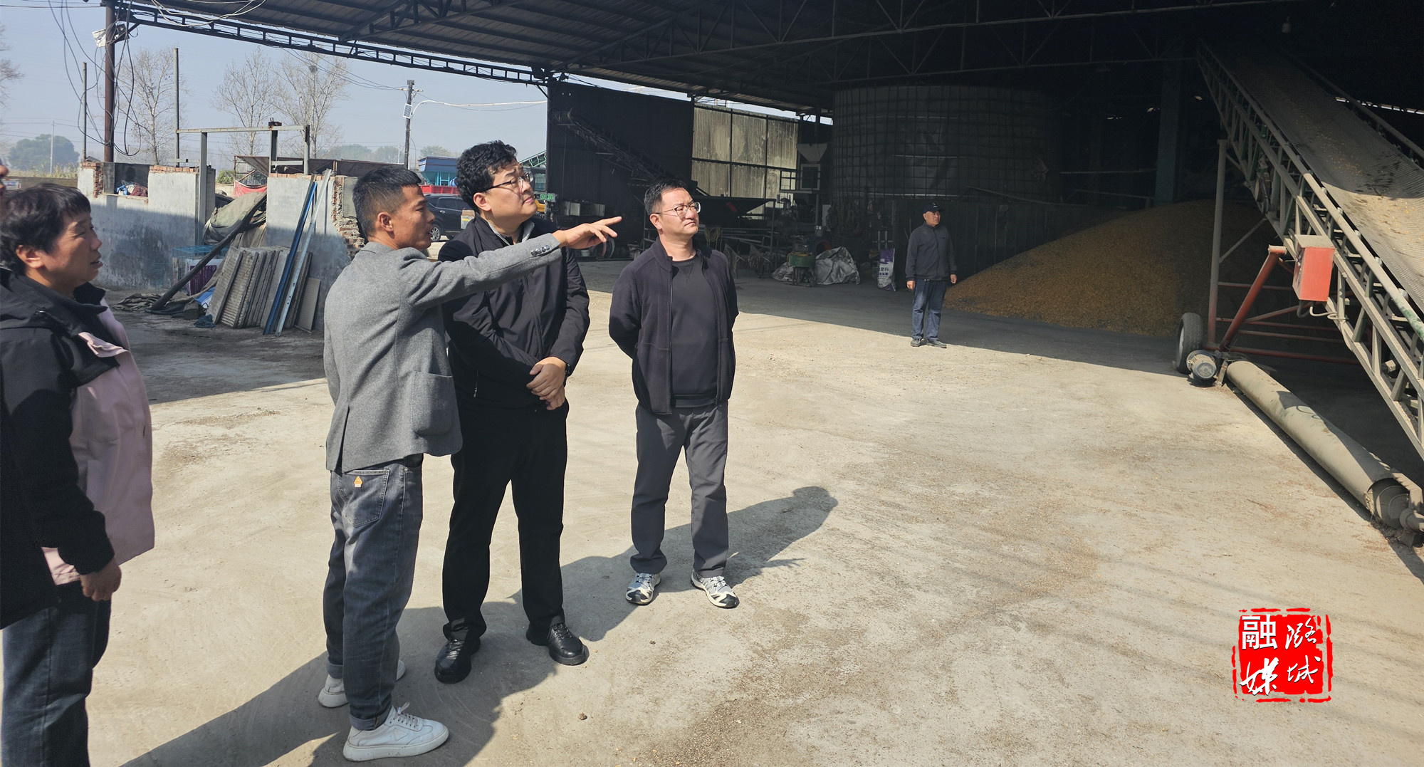 ▲成家川街道相关负责人到东邑村融合农业产业园查看烘干设备建设运行情况。
