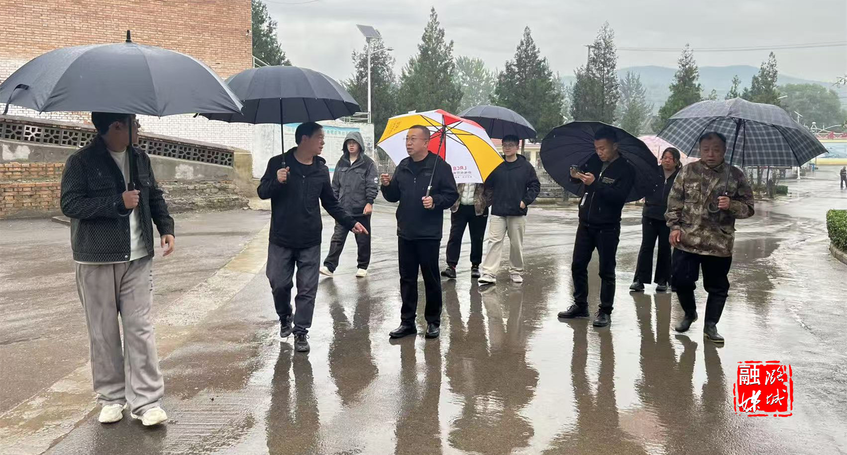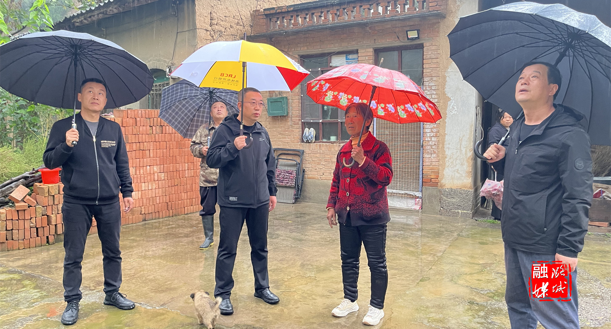 ▲微子镇负责人在韩家园村查看道路及房屋受损情况。