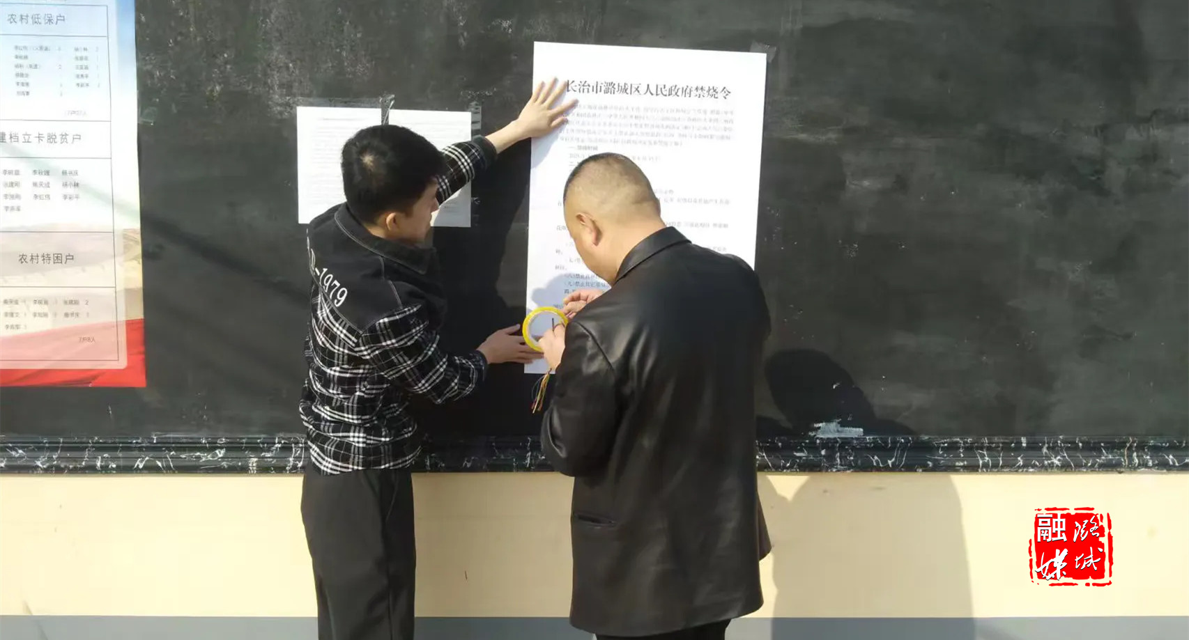 ▲翟店街道工作人员到村张贴禁烧令,推进护林防火工作。