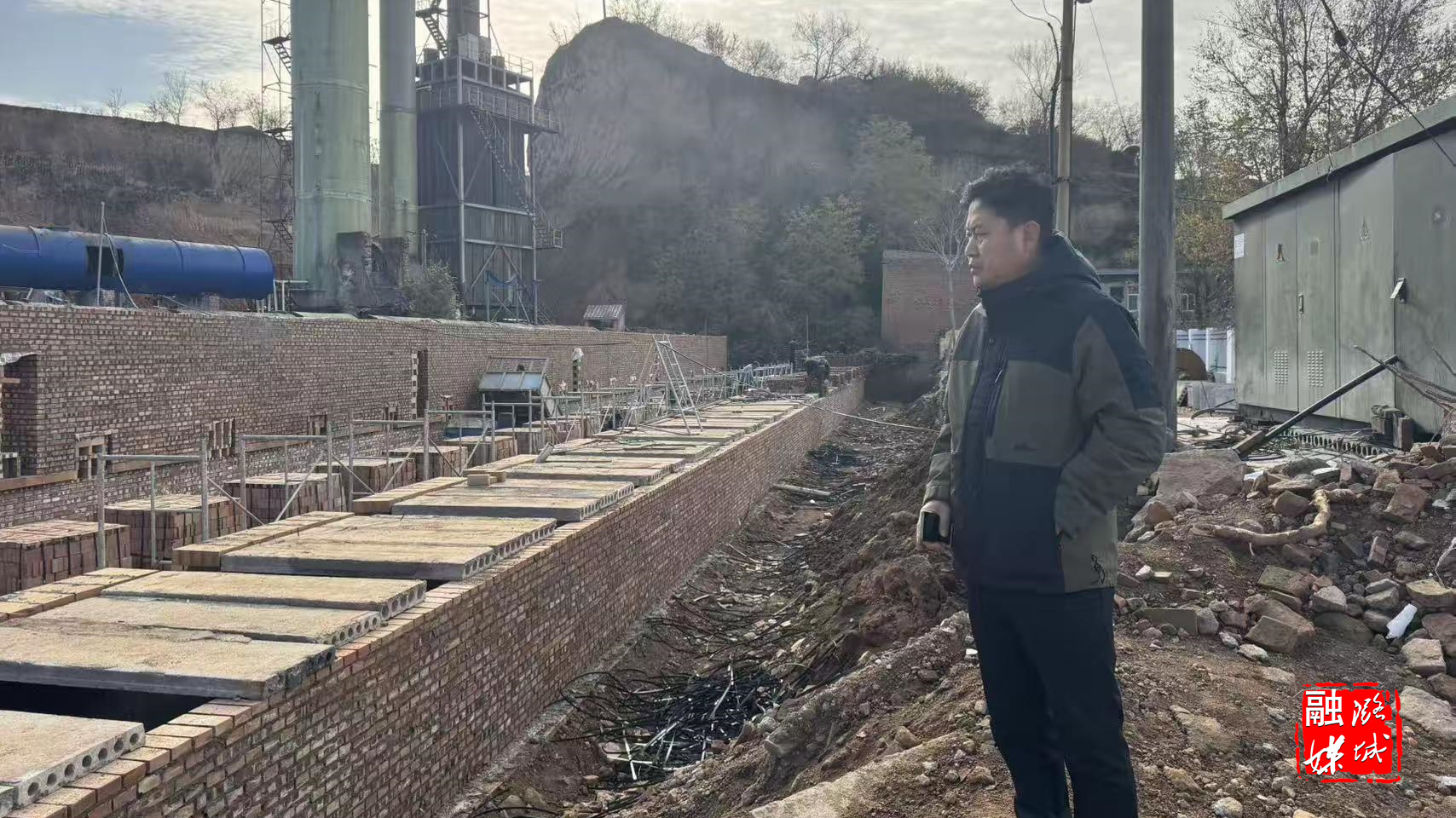 ▲微子镇负责人在微子镇中学查看一级管网和换热站建设进度。