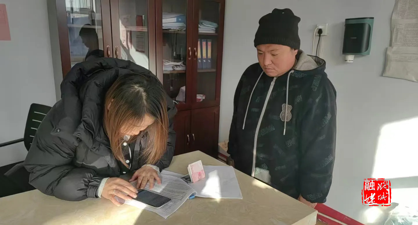 ▲店上镇韩村、洪岭村工作人员帮助村民缴纳医疗保险。