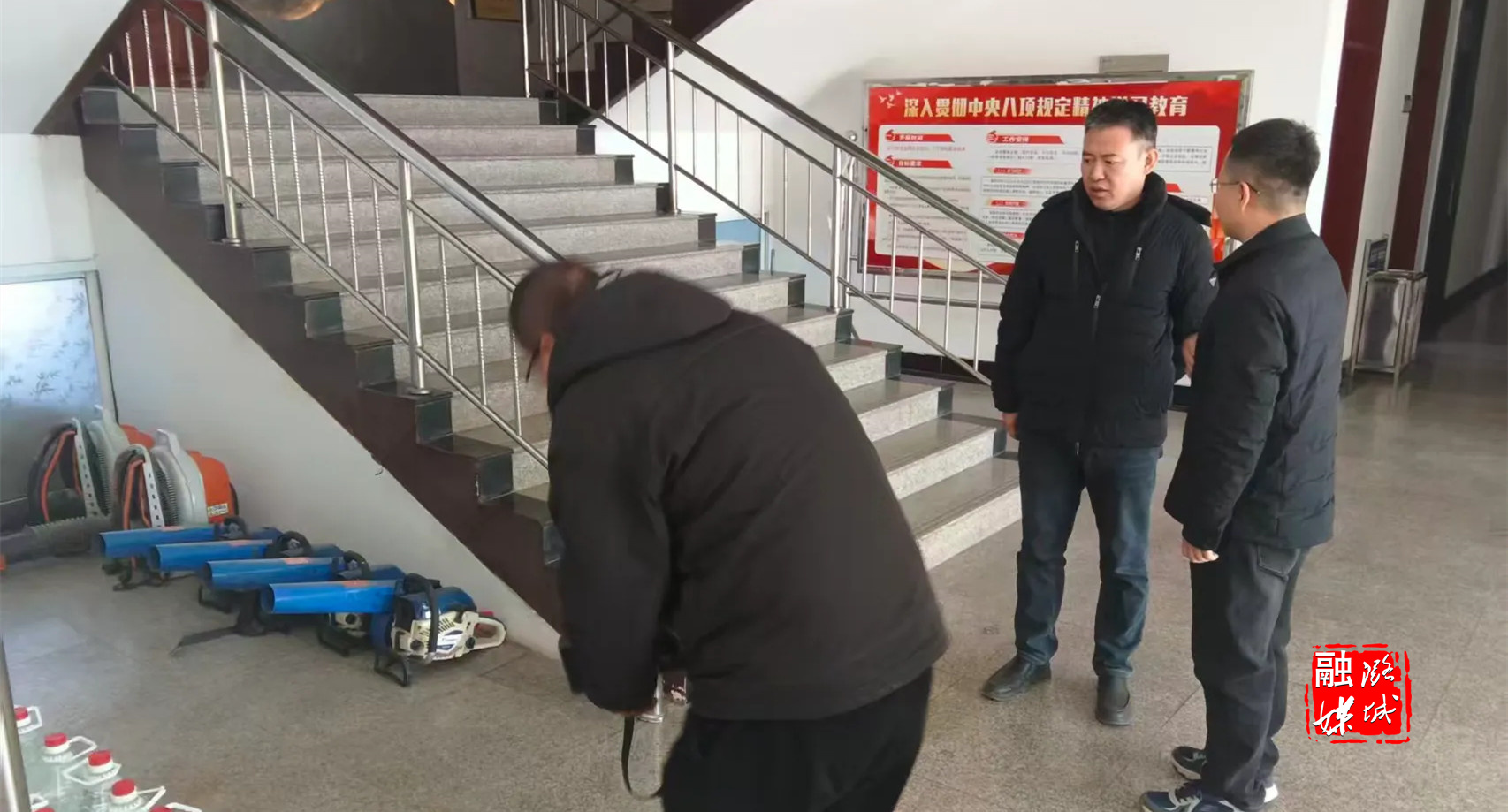 ★12月4日,辛安泉镇相关负责人同市森林防火指挥部工作人员就防火物资储备情况进行查看。