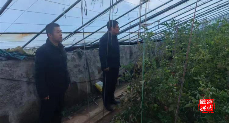 ▲微子镇工作人员在西靳村和东靳村查看大棚蔬菜长势情况。