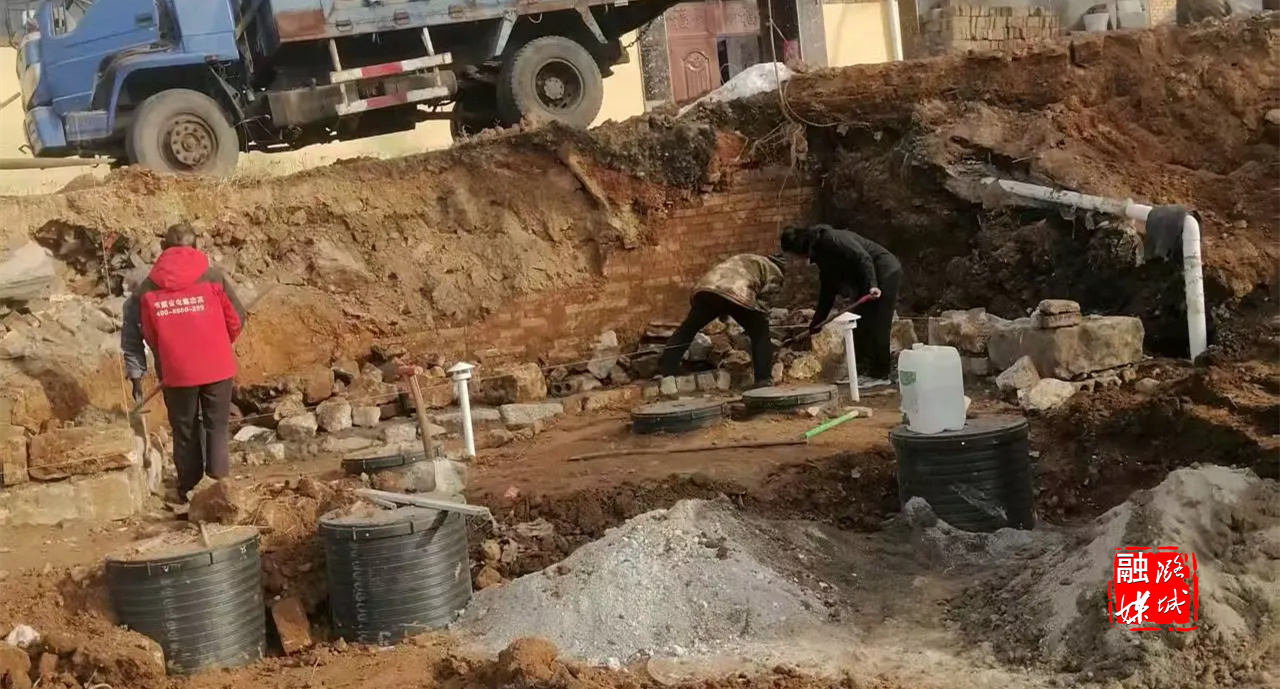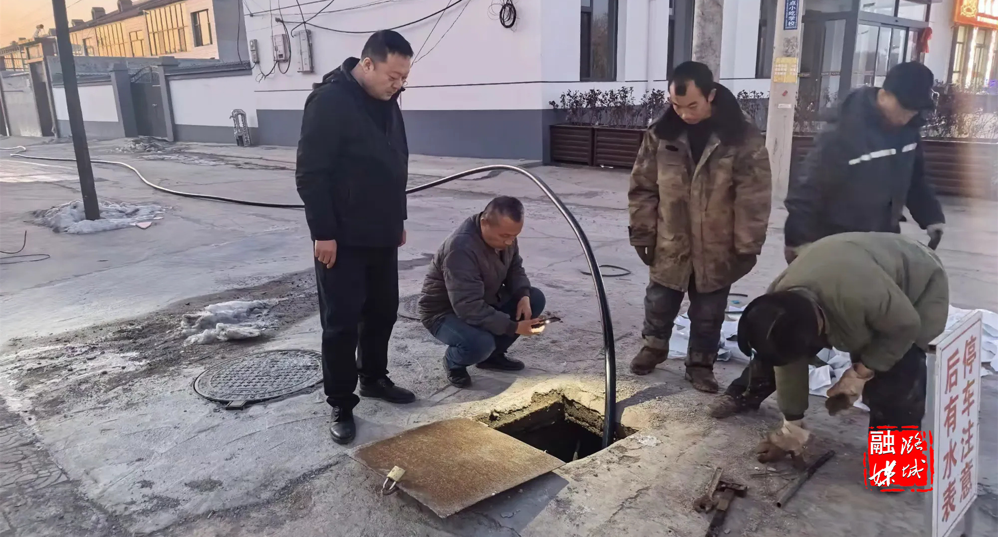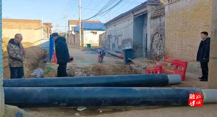 ▲微子镇工作人员在微子村查看供热管网安装进度。