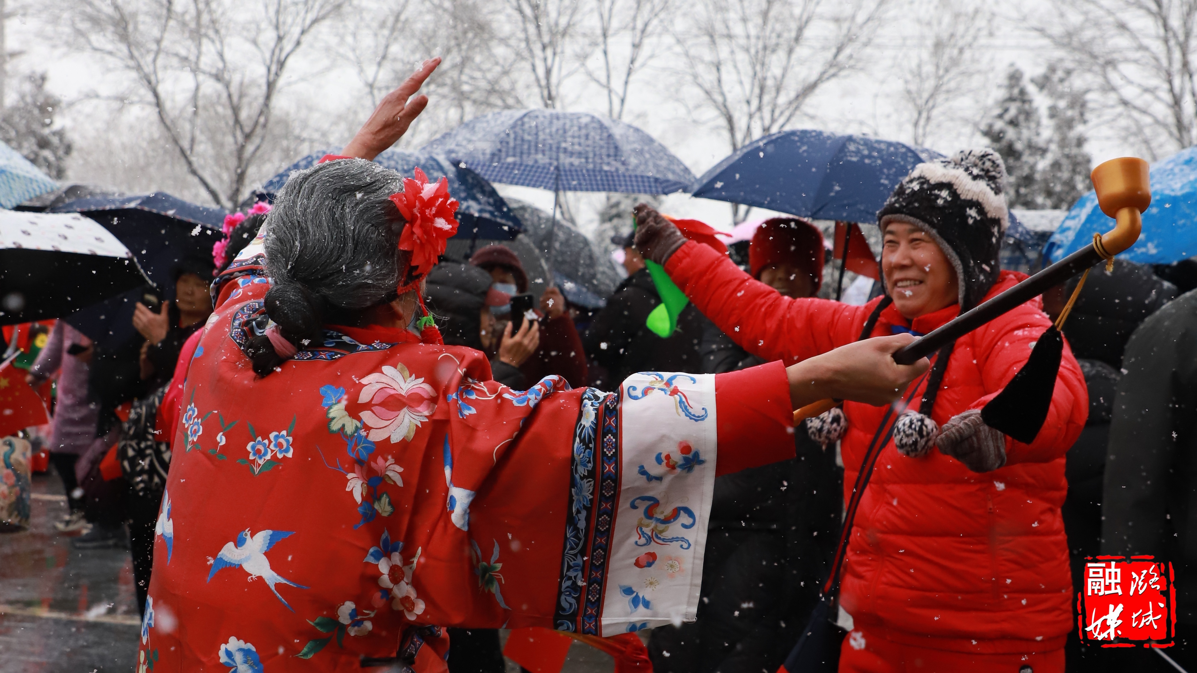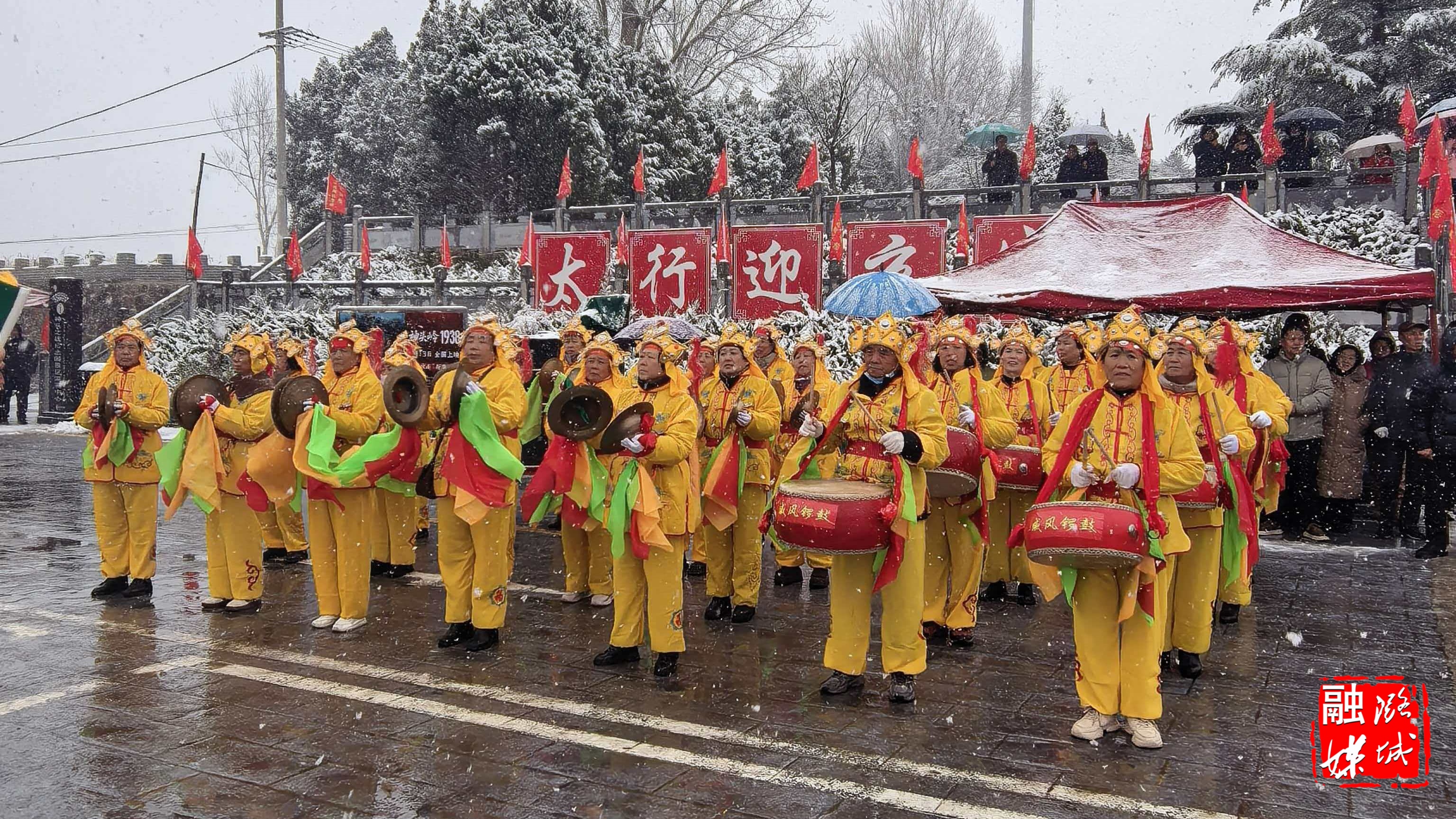 欢快的秧歌扭起来,喧天的锣鼓响起来。伴着漫天纷飞的瑞雪,地道的社火表演轮番登场,赢得阵阵喝彩。拍照留念之余,不少游客还加入到表演队伍中沉浸式感受传统民俗魅力,尽情享用潞城人民精心烹制的文化盛宴。