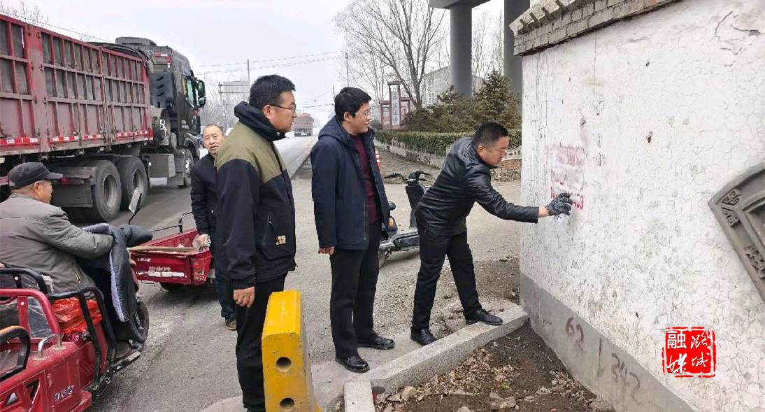 ★3月17日,微子镇相关负责人在微子村查看墙体广告清理情况。