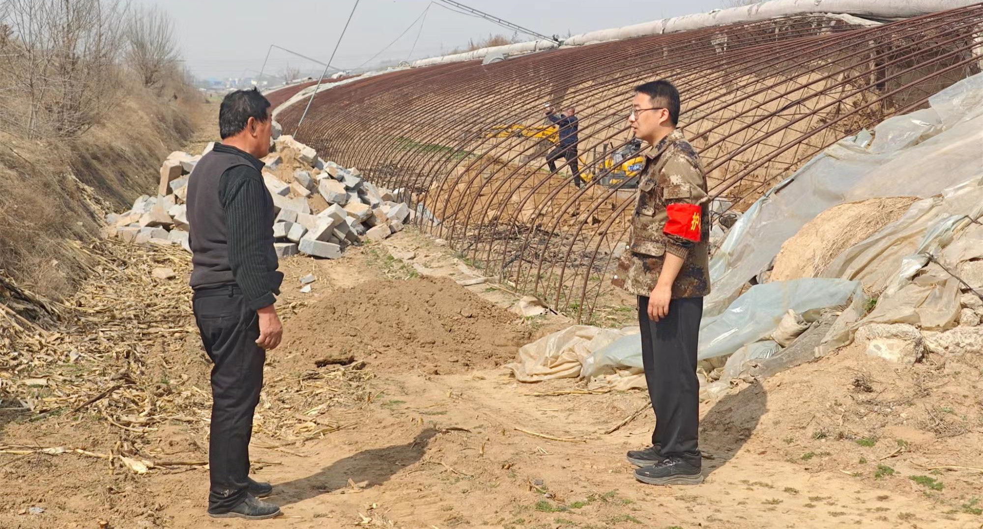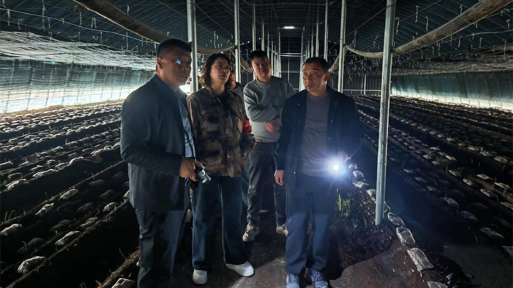 ▲微子镇相关负责人在西靳村查看羊肚菌种植基地项目建设情况。