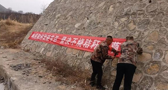 ▲黄牛蹄乡林业站工作人员到各村查看森林防火值班情况并悬挂条幅。