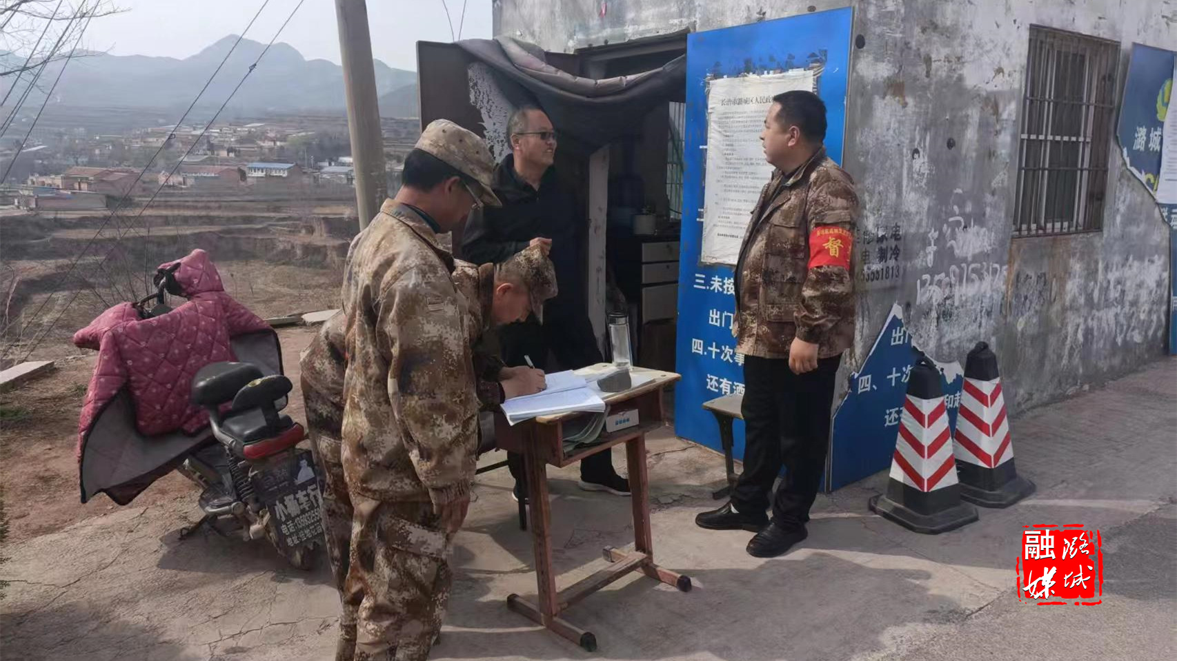▲辛安泉镇相关负责人在各村查看森林防火卡口值班值守及进山人员登记情况。
