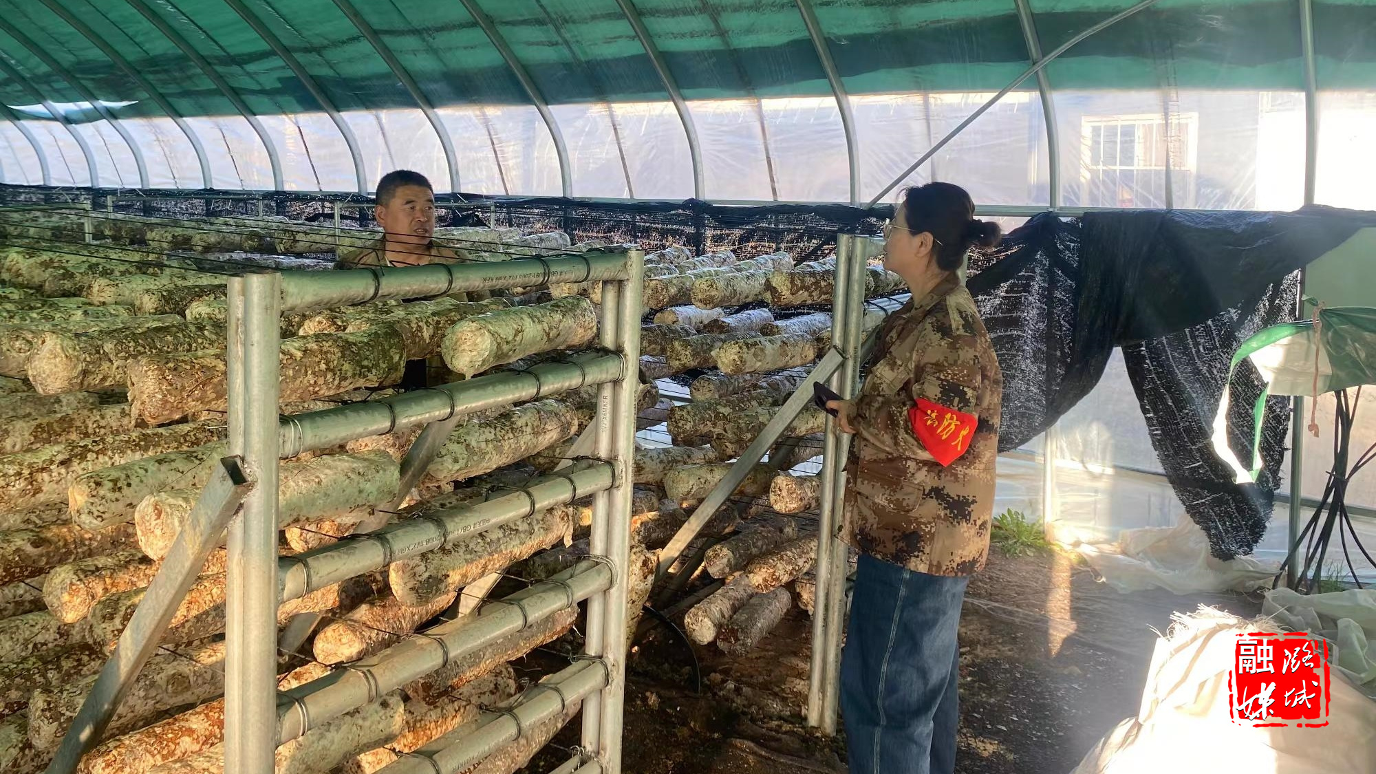 ★4月6日,微子镇相关负责人在东靳村查看香菇大棚运行情况。