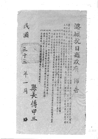 图为潞城区档案馆珍藏的潞城县抗日政府关于反对敌人抢粮抓丁的布告。