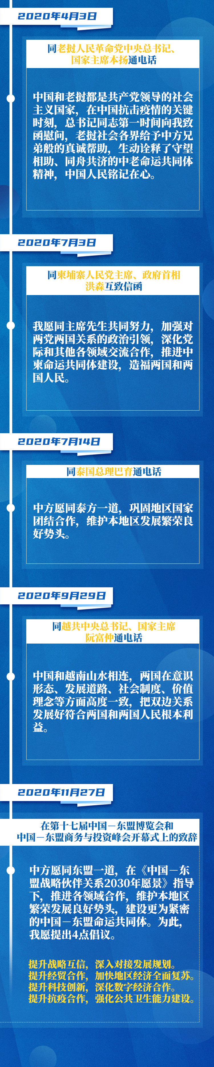 2020年11月27日,在第十七届中国—东盟博览会和中国—东盟商务与投资峰会开幕式上,习近平指出,中国—东盟关系成为亚太区域合作中最为成功和最具活力的典范,成为推动构建人类命运共同体的生动例证。