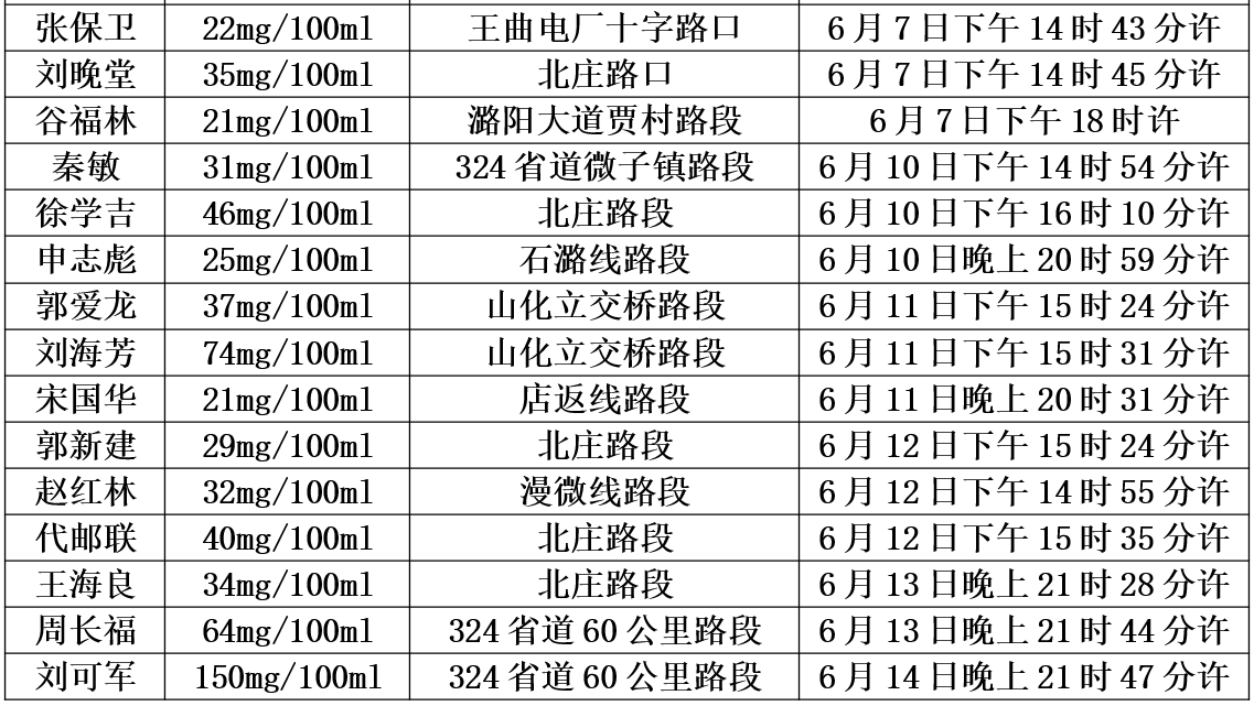潞城交警大队对以下酒驾、醉驾的违法人员进行曝光,请广大驾驶员牢记“酒后不开车,开车不喝酒”,为家人负责、为自己负责、为社会负责,远离酒驾,珍爱生命。