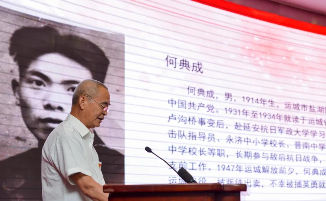 “今天要讲点儿父亲的事,搜肠刮肚,也拼凑不出一个完整的故事。”说到这里,何文祥老人脸上浮现出一抹回忆不可得的神情,让观众深深感动。他的父亲何典成,1914年生于运城市盐湖区,1932年加入中国共产党,从此少年立志、许身救国。师范毕业后,他一度以小学教员的身份作掩护开展地下工作,先后化名“老五”“子午”,还曾改名“和平”,表明为建立新中国而奋斗的志向。1947年,他领导学生支援解放运城战役时,被叛徒出卖,不幸被捕,英勇就义时年仅34岁。