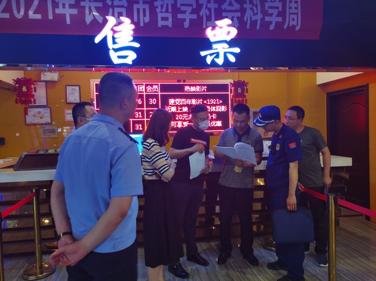 ▲6月21日,区委宣传部组织公安分局、消防大队、市场监管局、应急管理局、文旅局、文化执法队等相关单位对世纪影城电影院开展安全生产专项检查。