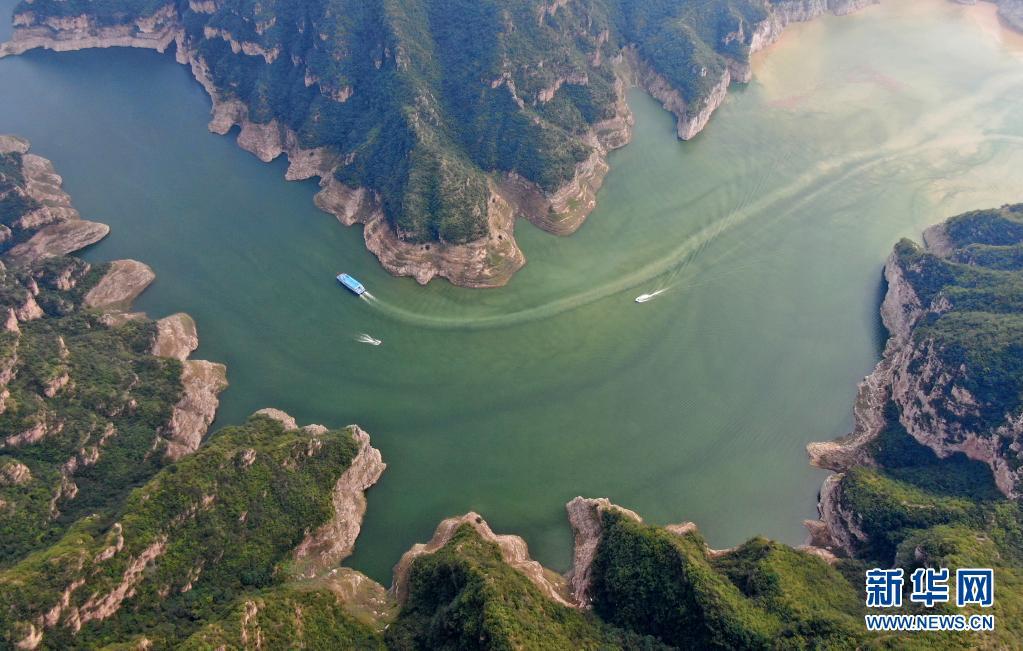 这是在河南济源拍摄的“黄河三峡”景色(2020年9月12日摄,无人机照片)。在黄河河南段,沿黄各地生态廊道建设如火如荼,黄河母亲梳洗旧颜,披上“绿裳”。新华社记者 郝源 摄