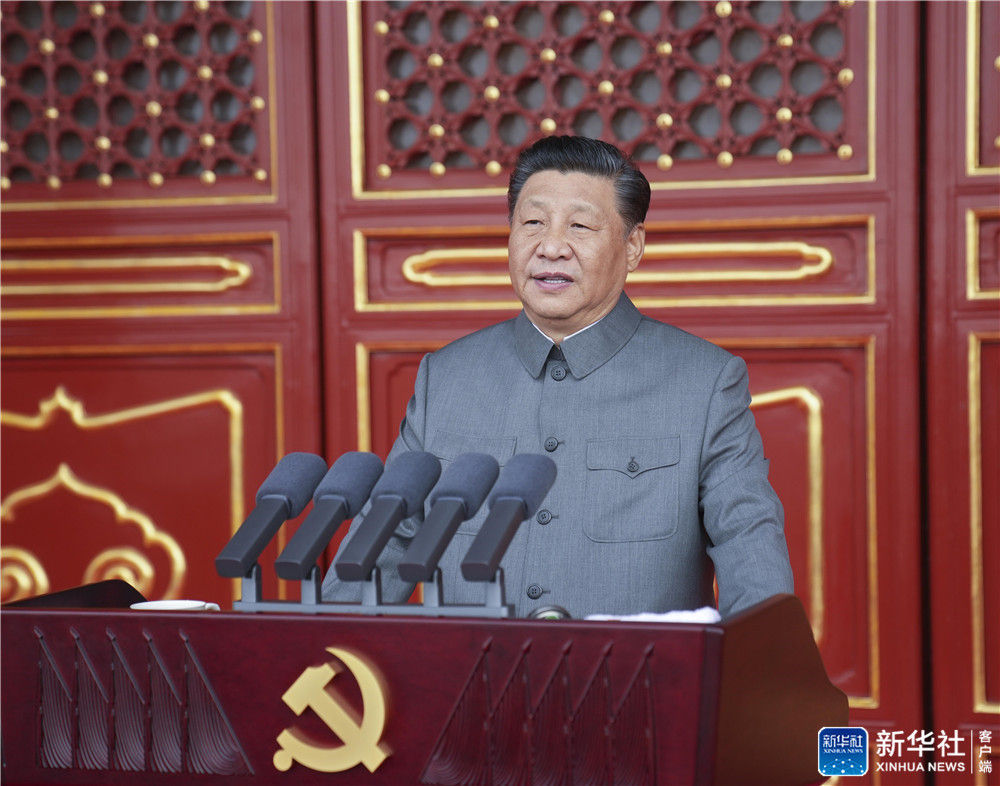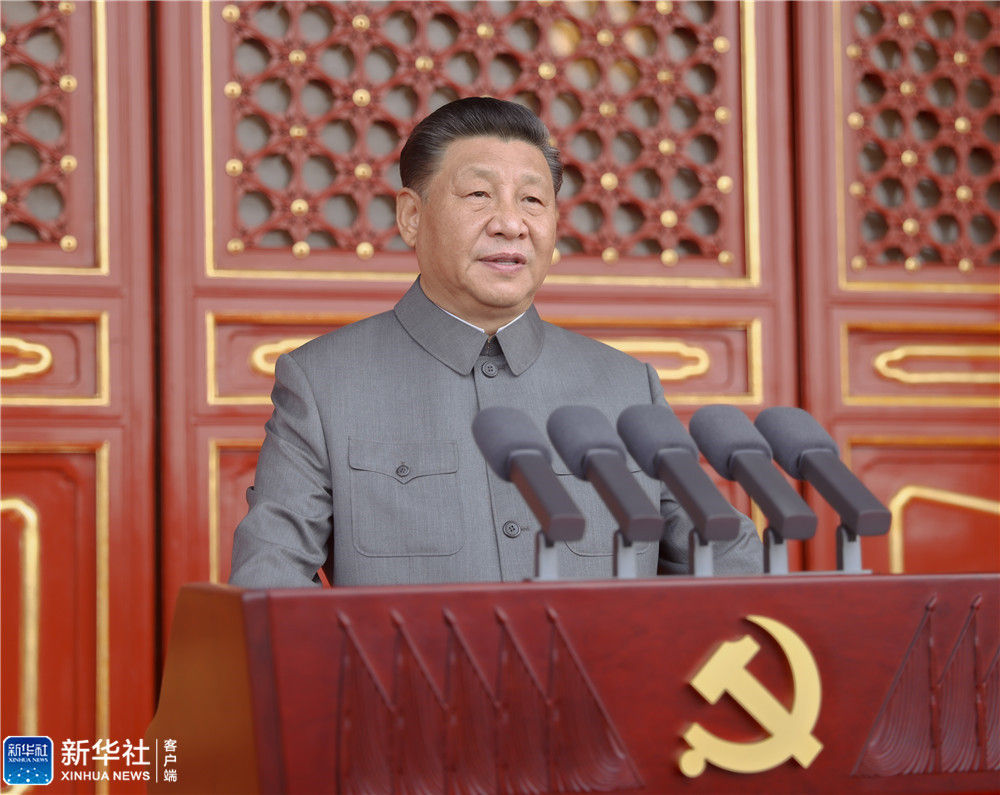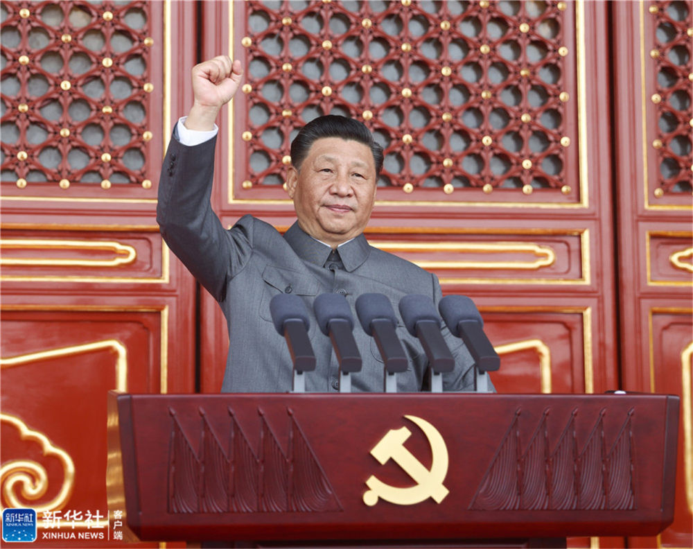 7月1日,庆祝中国共产党成立100周年大会在北京天安门广场隆重举行。中共中央总书记、国家主席、中央军委主席习近平发表重要讲话。这是习近平在天安门城楼上。新华社记者 庞兴雷 摄