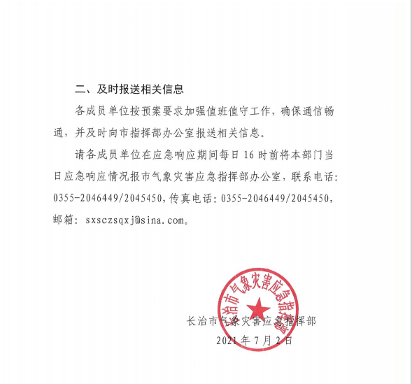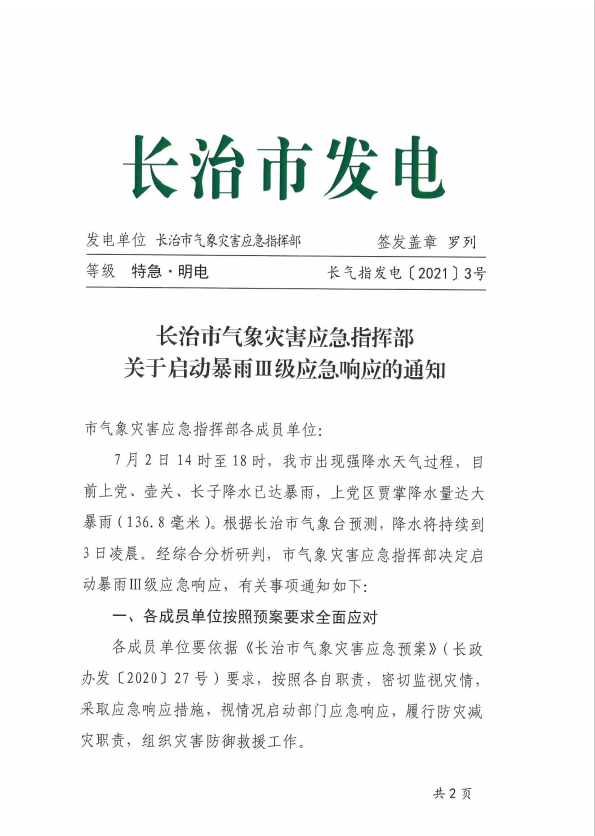 长治市气象灾害应急指挥部关于启动暴雨Ⅲ级应急响应的通知