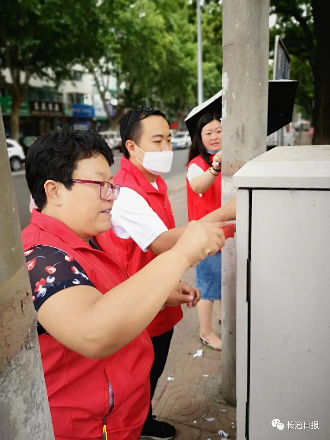 崔永明与社区工作人员一同清理小广告。
