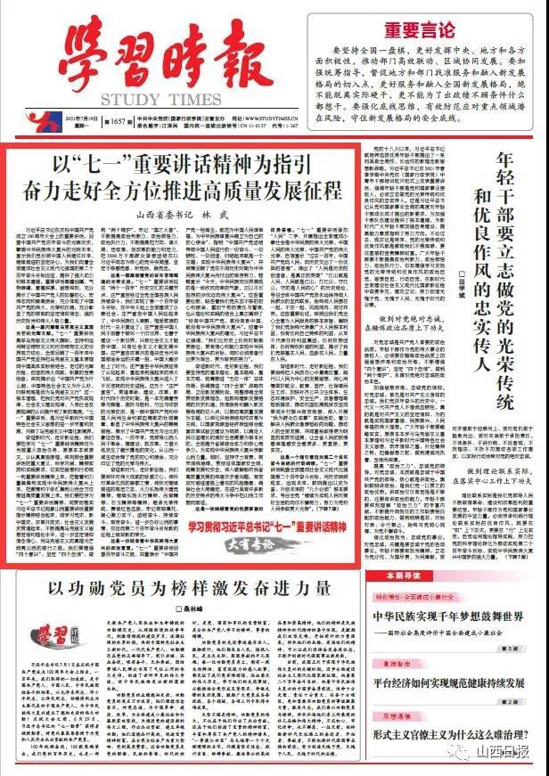 奋进新时代、走好新征程,我们要把学习“七一”重要讲话精神作为当前重大政治任务,原原本本读原文,认认真真悟原理,深刻领会重要讲话的重大意义、科学内涵、精神实质和实践要求,切实把思想和行动统一到重要讲话精神上来,把智慧和力量凝聚到实现中华民族伟大复兴上来,把激情和干劲汇集到山西全方位推进高质量发展上来。我们要把学习“七一”重要讲话精神,同贯彻落实习近平总书记视察山西重要讲话重要指示精神结合起来,同学习党史、新中国史、改革开放史、社会主义发展史贯通起来,不断提高马克思主义思想觉悟和理论水平,进一步坚定信仰信念信心,用马克思主义的真理光芒照亮山西的前行之路。我们要增强“四个意识”、坚定“四个自信”、做到“两个维护”,牢记“国之大者”,不断提高政治判断力、政治领悟力、政治执行力,不断提高把方向、谋大局、定政策、促改革的能力和定力,把3500万干部群众紧密团结在以习近平同志为核心的党中央周围,坚定不移感党恩、听党话、跟党走。