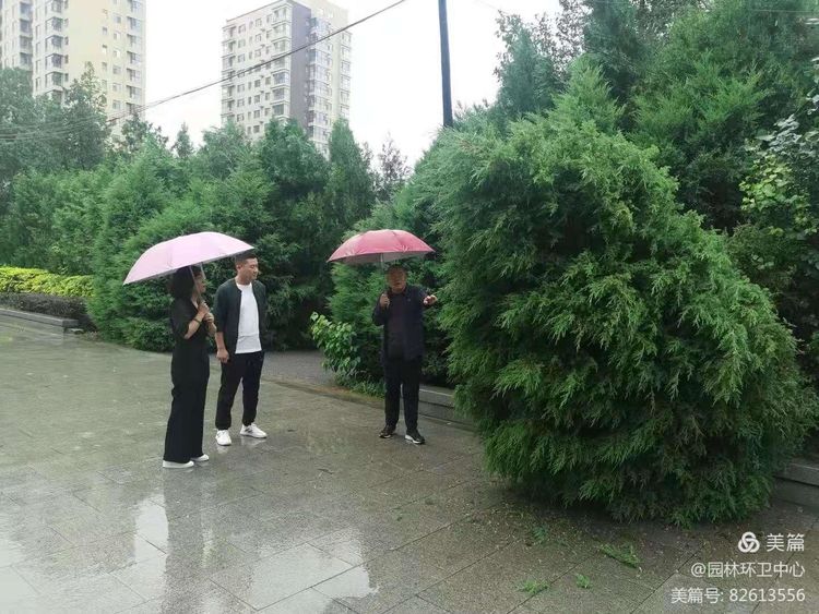 ▲7月21日上午,区园林环卫中心负责人深入南华公园实地查看防汛工作。