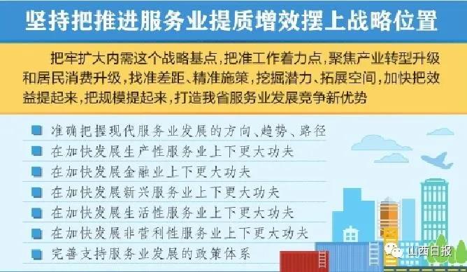 林武指出,推进服务业提质增效,要着力补齐补强短板弱项,全面提高服务业的综合竞争力、创新驱动力、产业带动力、经济支撑力、可持续发展力。要在优化布局上聚焦发力,推进太原都市区一体化发展,加快山西中部城市群建设,形成省会带动、多点辐射、网络发展的格局,全力打造我省现代服务业的发展引擎。要在培育主体上聚焦发力,深化“放管服”改革,持续打造市场化法治化国际化营商环境,不断激发现代服务业的活力潜力。要在建强平台上聚焦发力,学习借鉴集聚区发展先进经验,用好集聚发展模式,示范先行,扩容升档,聚业兴产,下决心抓好现代服务业集聚区建设,全面提升服务业发展能级和水平。要在项目建设上聚焦发力,加强服务业重大项目的谋划、储备和实施,以一个个好项目大项目支撑现代服务业发展壮大。要在扩大消费上聚焦发力,深入落实国家扩大消费的政策举措,持续提高城乡居民收入水平,抓住文旅消费、社区消费、乡村消费、大宗消费等重点,推动消费提质扩容,不断提升消费对经济增长的拉动能力。