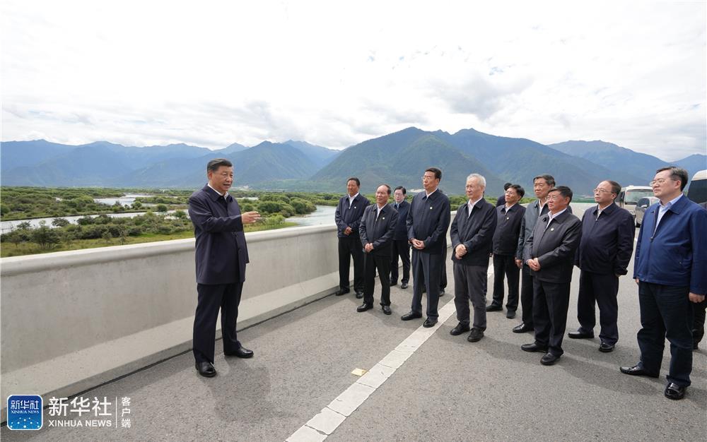 7月21日至23日,中共中央总书记、国家主席、中央军委主席习近平来到西藏,祝贺西藏和平解放70周年,看望慰问西藏各族干部群众。这是21日上午,习近平在林芝尼洋河大桥考察雅尼湿地。新华社记者 李学仁 摄