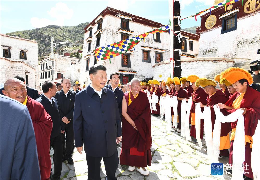 7月21日至23日,中共中央总书记、国家主席、中央军委主席习近平来到西藏,祝贺西藏和平解放70周年,看望慰问西藏各族干部群众。这是22日下午,习近平在位于拉萨西郊的哲蚌寺考察。新华社记者 谢环驰 摄