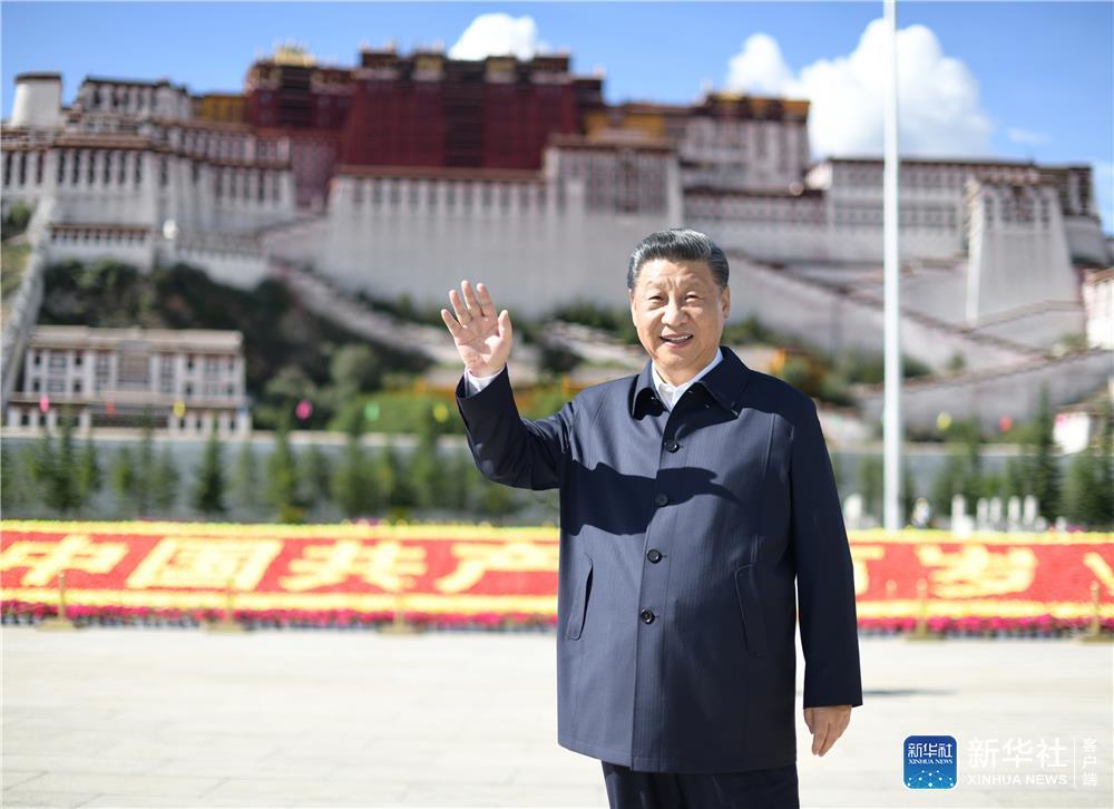 7月21日至23日,中共中央总书记、国家主席、中央军委主席习近平来到西藏,祝贺西藏和平解放70周年,看望慰问西藏各族干部群众。这是22日下午,习近平在布达拉宫广场考察时,向游客和当地群众挥手致意。新华社记者 谢环驰 摄