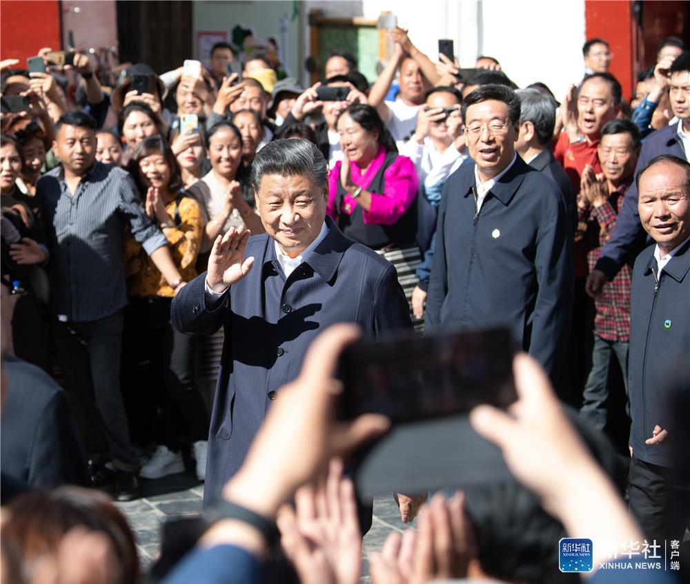 7月21日至23日,中共中央总书记、国家主席、中央军委主席习近平来到西藏,祝贺西藏和平解放70周年,看望慰问西藏各族干部群众。这是22日下午,习近平在考察位于拉萨市老城区的八廓街时,向各族群众挥手致意。新华社记者 申宏 摄