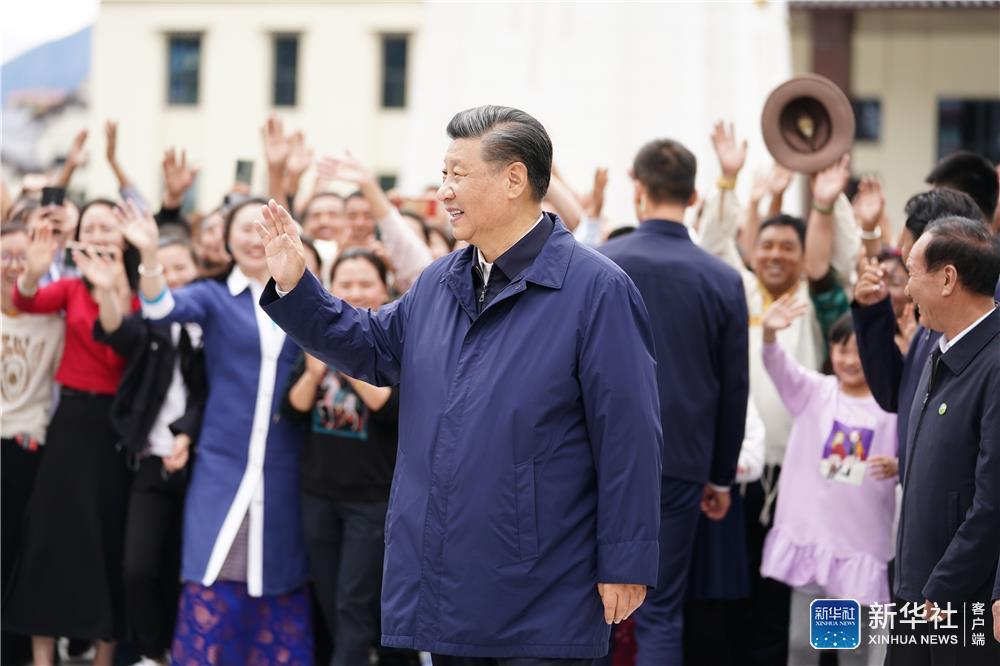 7月21日至23日,中共中央总书记、国家主席、中央军委主席习近平来到西藏,祝贺西藏和平解放70周年,看望慰问西藏各族干部群众。这是21日下午,习近平在林芝市巴宜区林芝镇嘎拉村考察时,向村民们挥手致意。新华社记者 申宏 摄
