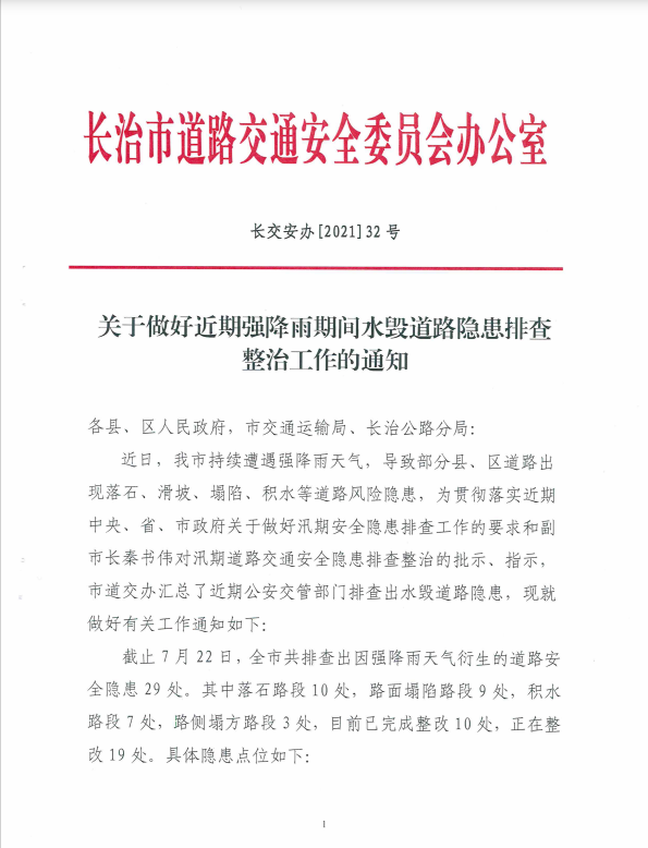 关于做好近期强降雨期间水毁道路隐患排查整治工作的通知