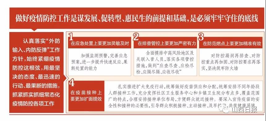 林武在讲话中指出,做好疫情防控工作是谋发展、促转型、惠民生的前提和基础,是必须牢牢守住的底线。要深入贯彻党中央及省委决策部署,认真落实“外防输入、内防反弹”工作方针,始终紧绷疫情防控这根弦,用最坚决的态度、最迅速的行动、最果断的措施,抓紧抓实抓细常态化疫情防控各项工作。一是在应急处置上要更加灵敏及时。加强监测预警,完善应急预案,进一步提升快速反应、果断处置的能力。立足更精准更有效地防,做好发热门诊信息登记和预检筛查,精准开展防控研判,做到早发现、早报告。深入开展疫情防控培训和应急指挥、联合处置演练,做好应对突发情况的各项工作准备,强化督促指导,确保第一时间反应,第一时间决策,第一时间处置,牢牢掌握防控主动权。二是在排查管控上要更加严密有力。全面摸排中高风险地区及关联入晋人员,落实各项管控措施,做到“应查尽查、应检尽检、应隔尽隔、应收尽收”。强化属地“第一落点”管控责任,关口前移,管控前置,实施有效的动态排查,织密织牢管控体系。三是在防范燃点上要更加精准有效。对防控漏洞再排查、对防控重点再加固、对防控要求再落实,坚决筑牢防火墙。要周密做好国际航班经停太原入境防控、进口冷链物流管理、医疗机构院感防控、隔离酒店管理等工作,确保各项工作措施环环紧扣、精准有效、不出纰漏。