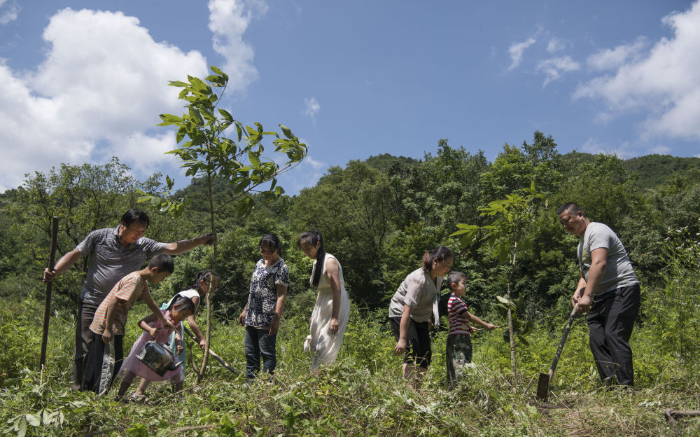 姚祖元(右一)与家人一起种树(2019年7月13日摄)。在秦岭深处的陕西省汉中市留坝县火烧店镇,姚家5代人历时70年深耕秦岭的故事在当地家喻户晓,传为佳话。新华社记者 陶明 摄