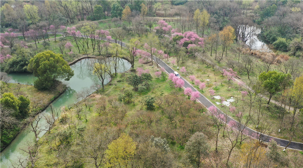 观光车在浙江杭州西溪湿地内行驶(2021年3月2日摄,无人机照片)。新华社记者 翁忻旸 摄