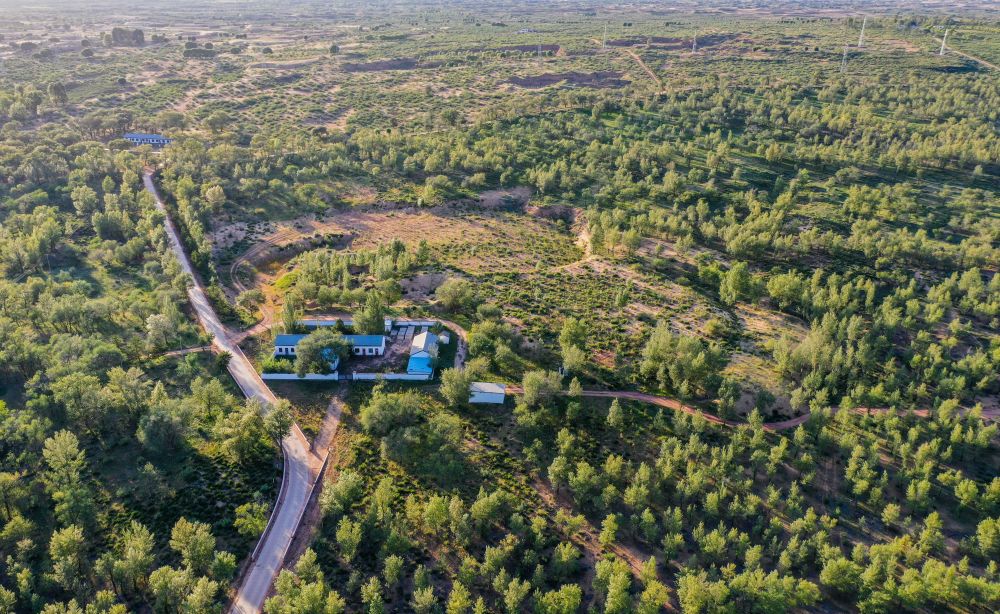 这是2020年9月7日在内蒙古鄂尔多斯市乌审旗毛乌素沙地拍摄的一处治沙站(无人机照片)。新华社记者 连振 摄