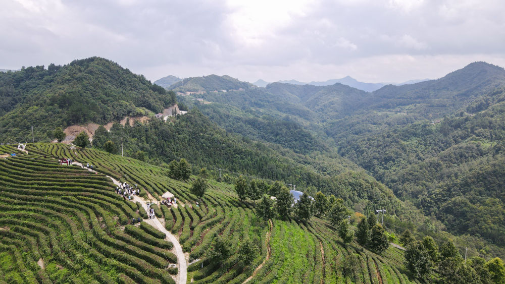 游客在位于陕西省安康市平利县老县镇蒋家坪村的女娲凤凰茶业现代示范园区参观游玩(2021年7月24日摄,无人机照片)。新华社记者 徐钦 摄