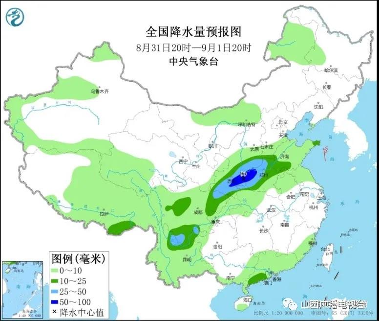 8月31日20时至9月1日20时,四川盆地东北部、西北地区东南部、华北地区南部、黄淮西北部、云南北部的部分地区有中到大雨,其中,陕西南部、河南西部等地的部分地区有暴雨(50~90毫米)(见图3)。