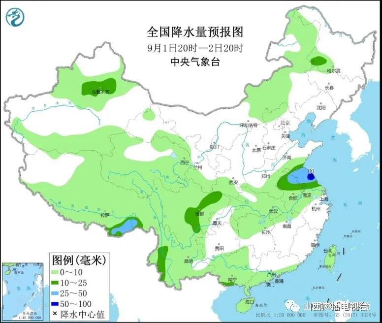 9月1日20时至2日20时,四川盆地、黄淮东部、西藏东南部的部分地区有中雨,其中,江苏北部部分地区有大到暴雨(50~60毫米)(见图4)。