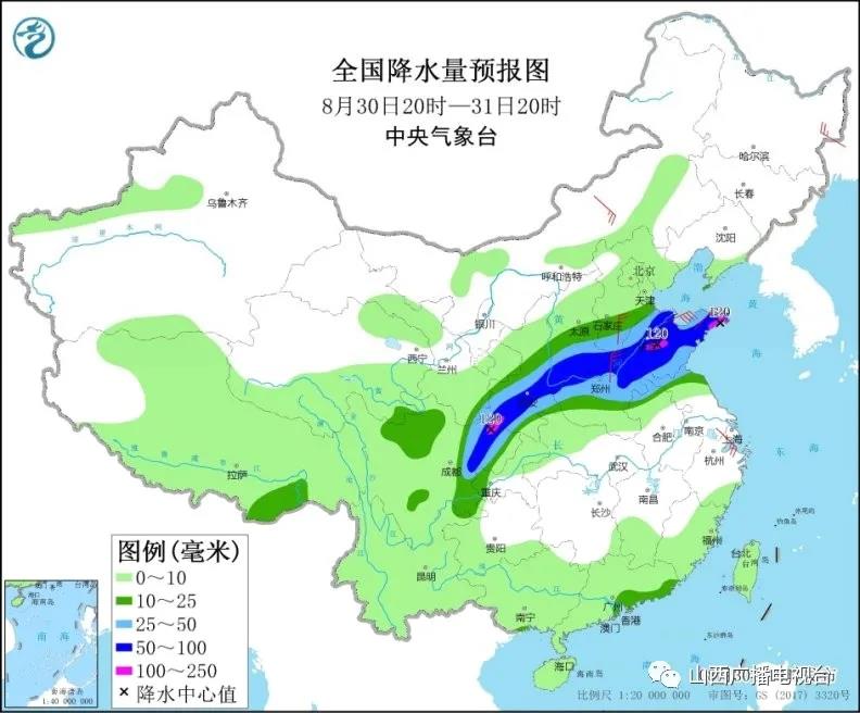 8月30日20时至31日20时,西北地区东部、华北南部、黄淮、川西高原北部、西南地区东北部、广东东南部沿海等地部分地区有中到大雨,其中,陕西中南部、山西南部、山东大部、河南北部、四川盆地东北部等地部分地区有暴雨或大暴雨(100~120毫米)。内蒙古中部、黄淮、华北南部等地部分地区有4~6级风(见图2)。