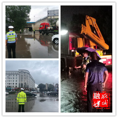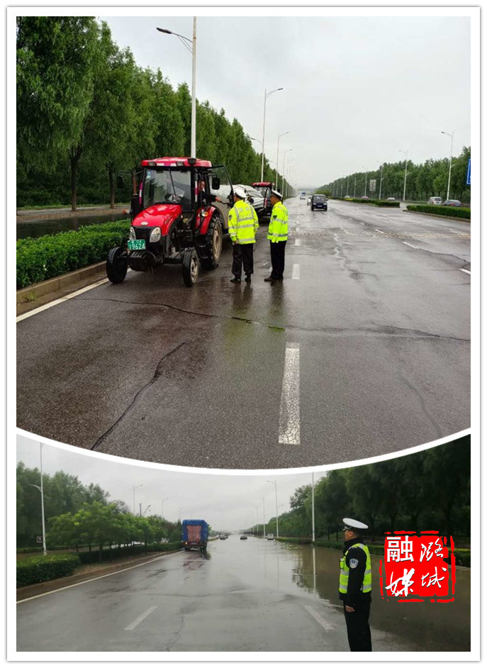 潞阳大道南天贡至小天贡路段因地势低洼造成较深积水,大队民警在积水路面两端指挥车辆绕行,并联系市政部门进行抽水作业,减少车辆溺水和人员受伤事件发生。