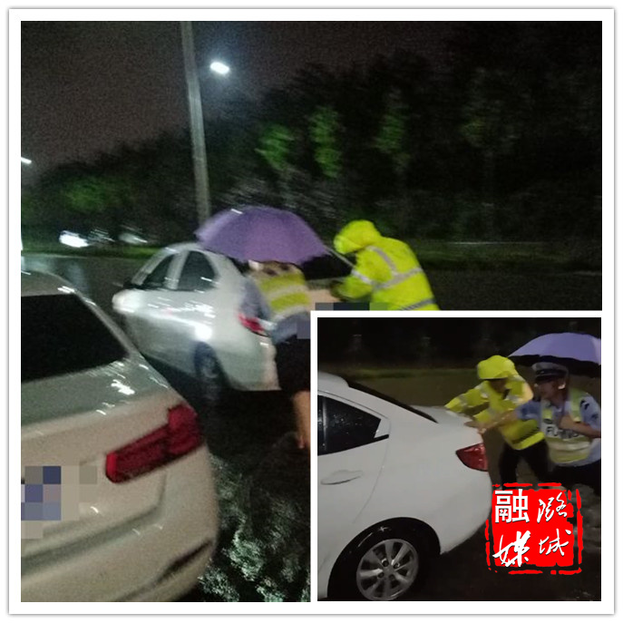昨晚22时15分许,驾驶员李某行驶至潞阳大道,受路面积水影响,轿车熄火。因担心对车辆造成进一步损毁,不敢再次打火。为尽快帮助司机脱困,微子镇中队民警帮助车主将车辆推至积水外。