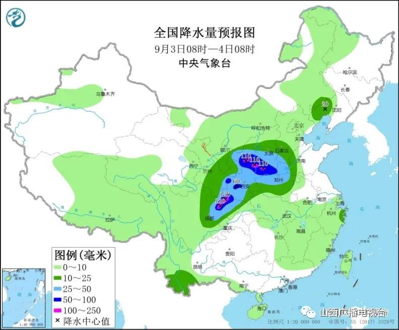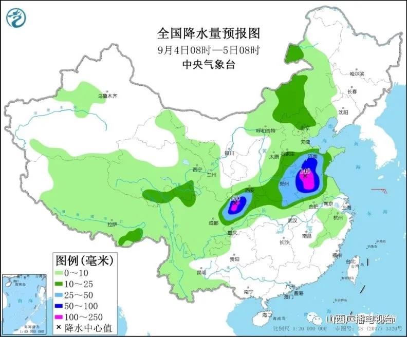3日至5日,西北地区东部至黄淮地区自西向东将有较强降水过程,西北地区东部、四川盆地、黄淮大部等地有大到暴雨、局地大暴雨;上述地区累计降雨量有30~60毫米,其中陕西南部、四川盆地北部和西部、河南中东部、山东南部、苏皖北部等地部分地区80~150毫米,陕西南部、四川东北部等地局地可达200~300毫米。7日之后,汉水流域降雨将明显减弱。预计,9月3日08时至4日08时,陕西大部、山西中南部、河北南部、河南中北部、四川盆地北部等地部分地区有大到暴雨,其中,陕西北部、山西南部、四川盆地西北部等地部分地区有大暴雨(100~120毫米)。上述部分地区伴有短时强降水(最大小时降雨量20~50毫米,局地可超过70毫米),局地有雷暴大风等强对流天气。中央气象台9月3日06时发布暴雨蓝色预警(图1)。