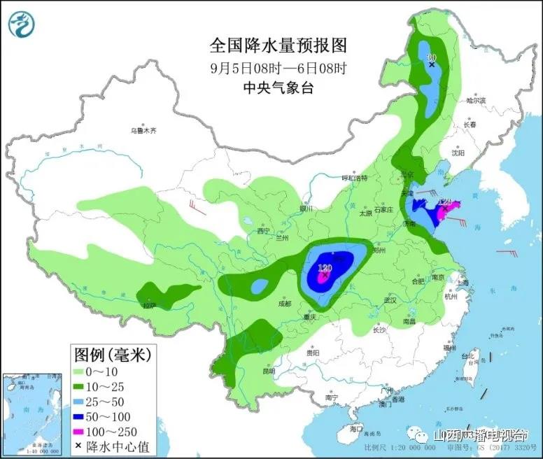 9月5日08时至6日08时,内蒙古东北部、陕西中南部、天津东部、山东中东部、河南西部、四川东北部等地部分地区有大到暴雨,其中,陕西南部、山东半岛、四川盆地东北部等地部分地区有大暴雨(100~120毫米)。青海北部部分地区有4~5级风(见图4)。
